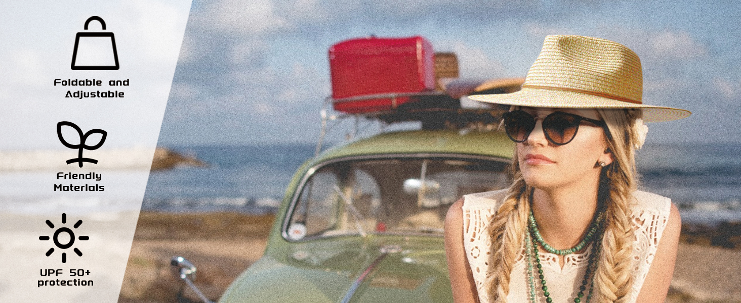 قابلة للطي والتعبئة: يمكن حمل قبعة الشمس ذات الحافة العريضة بسهولة داخل حقيبة اليد أو حقيبة الشاطئ، وهي قابلة للتعبئة ومريحة للحمل وتوفر الكثير من المساحة.