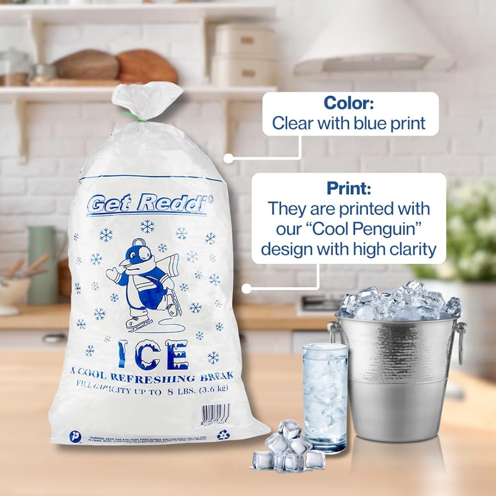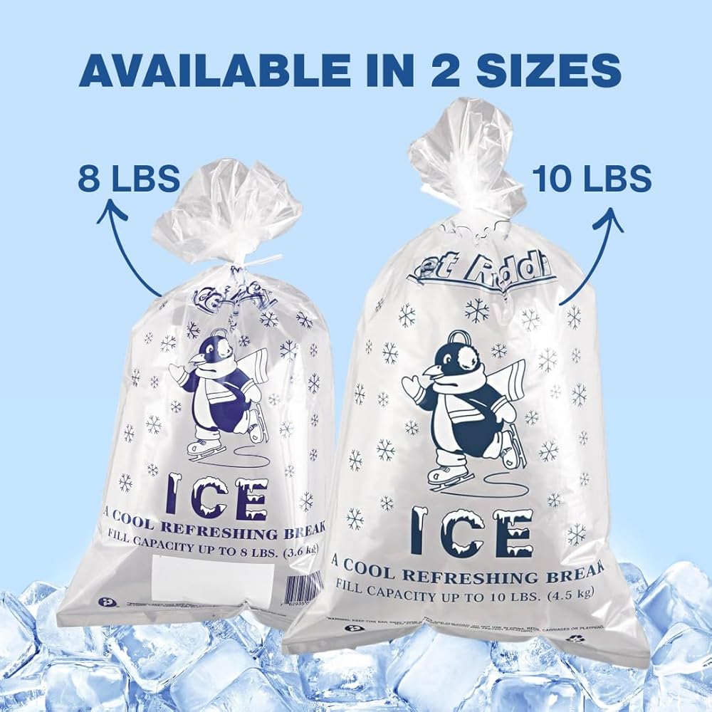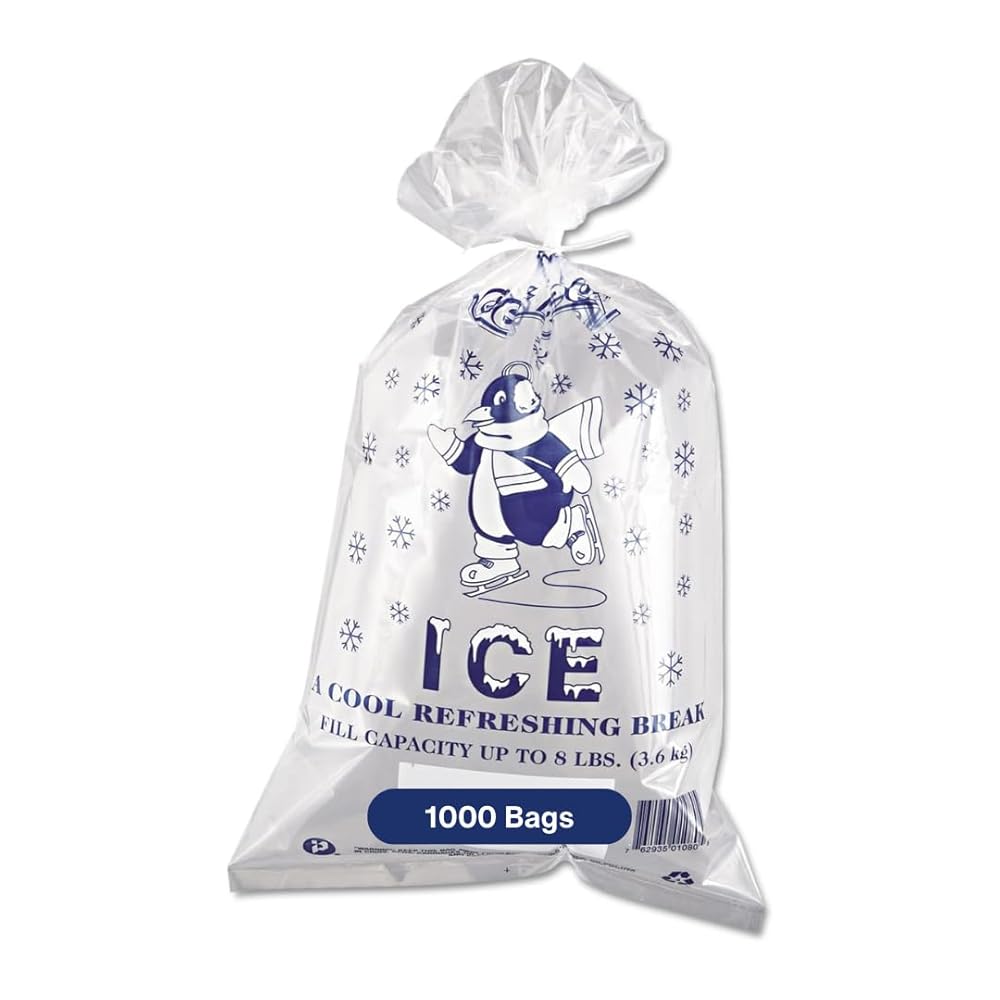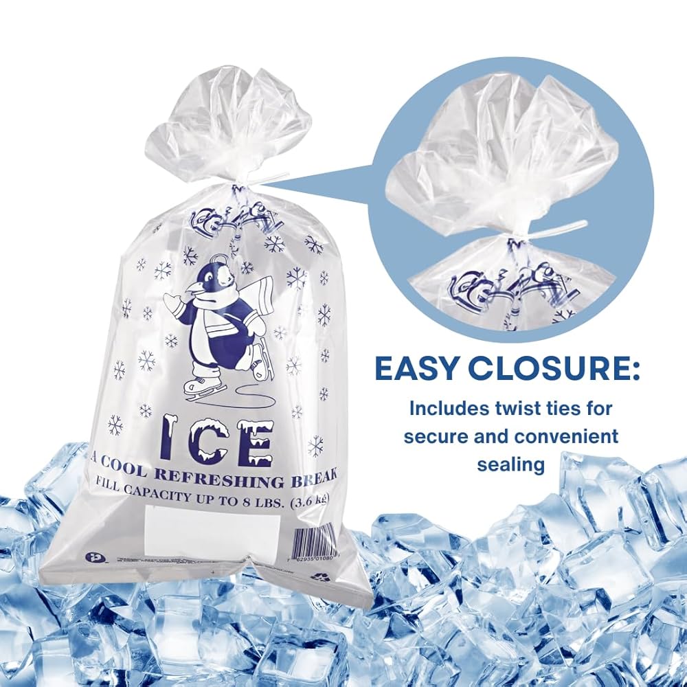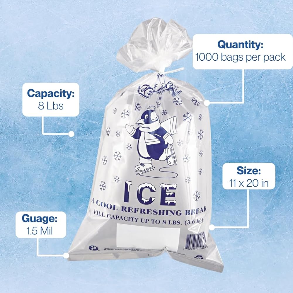 Cute "Cool Penguin" design decorates these sturdy polyethylene ice bags. Includes twist ties for easy closure. They're heavy-duty strength designed for maximum loading. Content added so bags can withstand freezing temperatures. Fill line printed on top of bags; net weight printed on bottom.