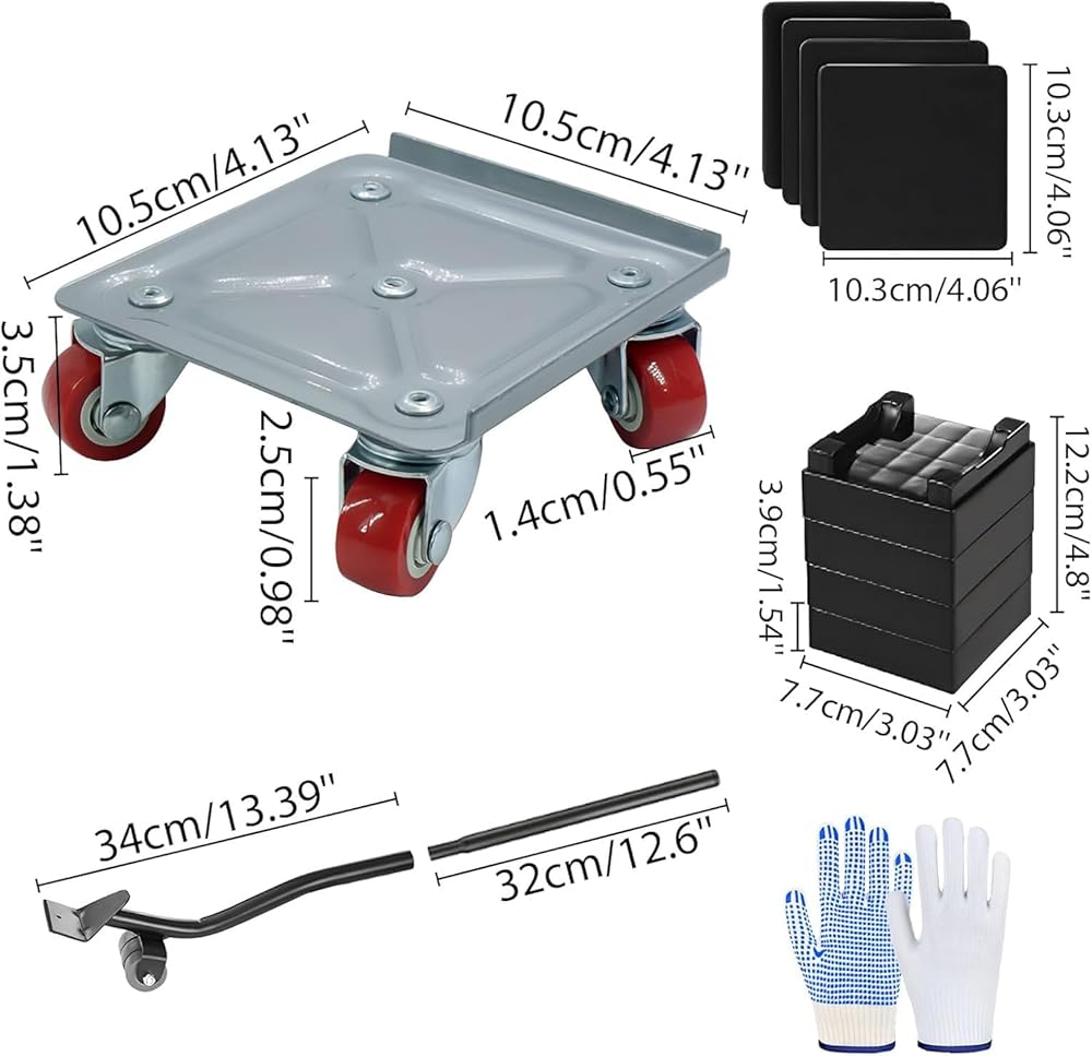 Surprise Package: Wheels for moving furniture lift mover tool set include 4x dolly,1x lift arm,4x heightening spacers for lift arm,4x non-slip mats,1x pair of safety gloves. Suitable for wooden floors, tile floors, and other hard surfaces, this set helps you move heavy furniture with minimal effort