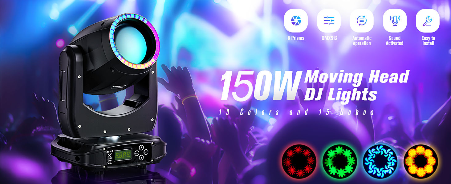 U'King 4 قطع 150 واط مصابيح أمامية متحركة أضواء DJ أضواء كاشفة 15 Gobos 13 لونًا 16 قناة DMX 512 مع صوت نشط لإضاءة المسرح وحفلات الزفاف