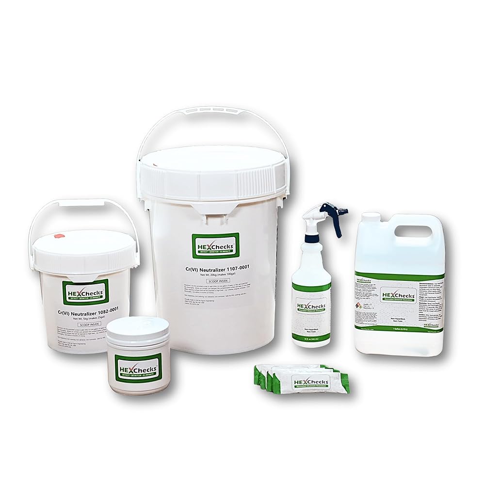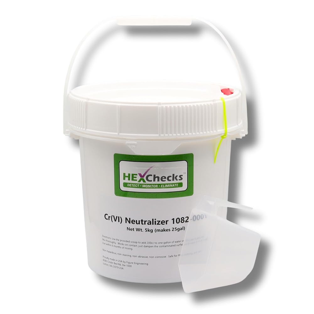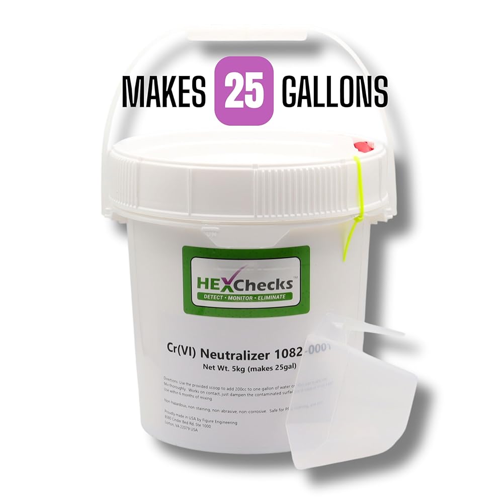 HexChecks Hexavalent Chromium Neutralizer chemically converts Cr(VI) on contact. Use it as you would an ordinary cleaning product. It works great for spraying, wiping, mopping, immersion, ride-on floor cleaners, wet foot baths, laundry, and even cleaning hands and PPE. Environmentally-friendly, non-toxic, non-staining, non-abrasive. Our Neutralizer is provided as a powdered concentrate, which saves you 98% in shipping weight, 99% in storage space, and simplifies your job site logistics. Use the provided scoop to mix gallons or quarts at a time. Add Neutralizer powder to water, mix thoroughly, and spray, hose, or wipe surfaces to neutralize on contact. Unlike other products that are soaps or detergents and merely move hex chrome around, HexChecks Neutralizer eliminates hex chrome on contact via chemical reaction. Conveniently sized for big jobs, one 5kg pail makes a total of (25) gallons or (95) liters. Following cleaning with HexChecks Neutralizer, use a HexChecks Test Swab to confirm the jobsite is safe and free of Cr(VI).