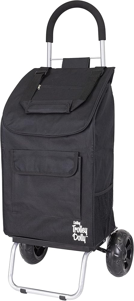 The folding Trolley dolly folds in 1/2 for compact storage. It has a comfort cushion handle that allows you to pull it anywhere. The folding Trolley dolly is designed with 7 compartments/pockets including a beverage holder. The oversized beefy wheels allow for smooth rolling on any surface including cobblestones, sand, stairs or any uneven surfaces. Carry everything from utilities, small groceries, and laundry with this lightweight wheeled push handcart.