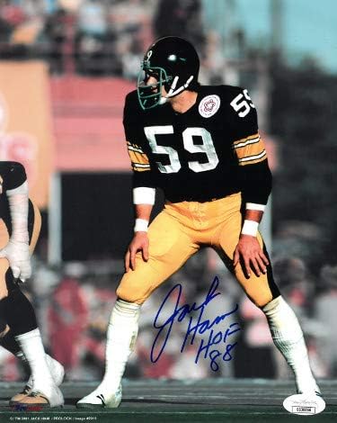 Jack Ham was the Pittsburgh Steelers secondround draft pick in the 1971 NFL Draft out of Penn State, where he was an AllAmerican. He won the starting left linebacker job as a rookie. He was Firstteam AllPro six years and was named to eight straight Pro Bowls. Ham was a member of 4 Super Bowl winning teams during his 12 year career, all of it spent with the Steelers. Jack Ham has hand signed this Pittsburgh Steelers 8x10 Photo with HOF 88 inscription. JSA Hologram and JSA Certificate of Authenticity . Features. Jack Ham Signed Pittsburgh Steelers HOF 88 Photo with Jersery. Perfect gift for any Sports fan. Stunning colorsSpecifications. Color Black. Size 8 x 10 in.