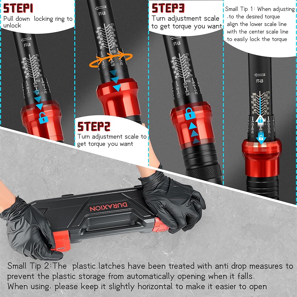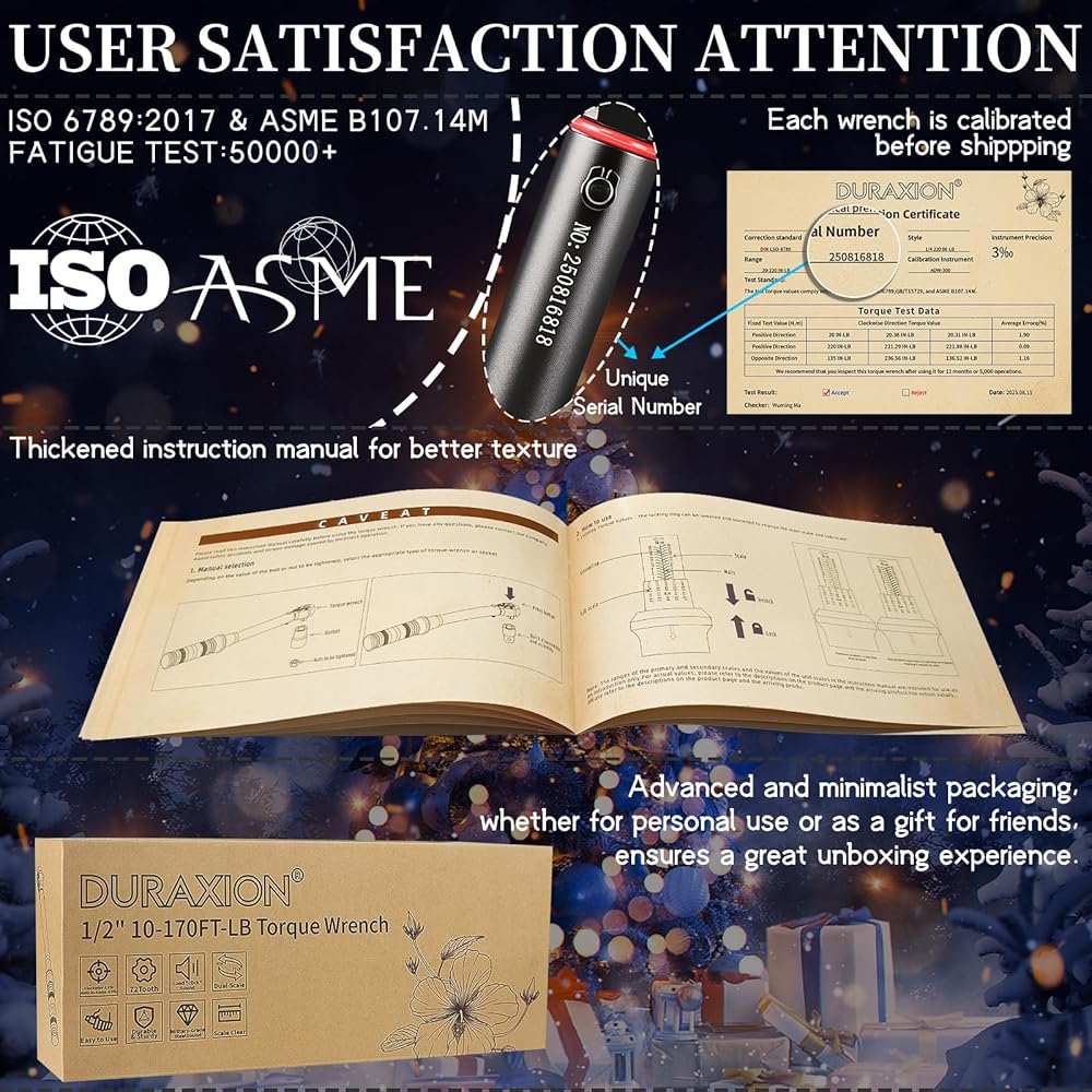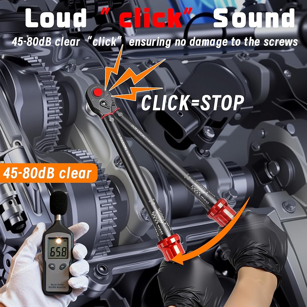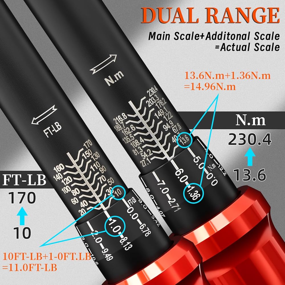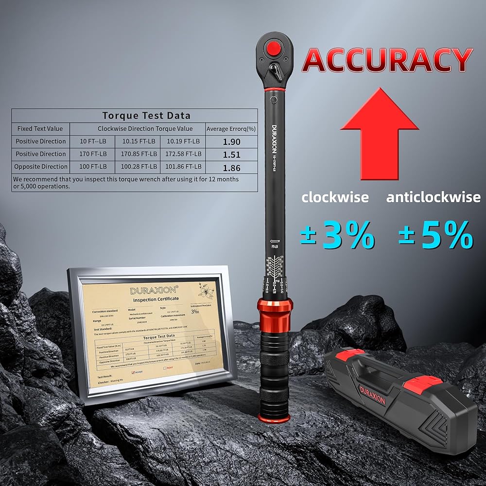 • 【±3% عزم دوران عالي الدقة】تتميز مجموعة مفاتيح عزم الدوران هذه بنطاق مزدوج يبلغ 10-170 قدمًا (13.6-230.5 نيوتن متر). يشتمل مفتاح عزم الدوران على شهادة معايرة برقم تسلسلي فريد. توفر آلية إيقاف النقر ردود فعل مسموعة وملموسة عند الوصول إلى عزم الدوران المحدد مسبقًا، مما يمنع الشد الزائد أو الزائد.