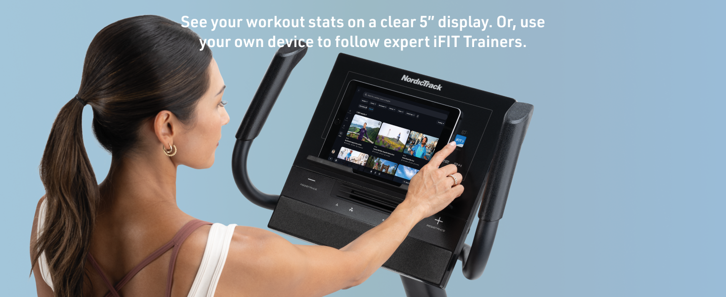 [شاشة LCD مقاس 5 بوصات ورف الجهاز] - اطلع على إحصائيات التمرين المباشر على شاشة LCD الواضحة مقاس 5 بوصات أو استخدم جهازك الخاص لمتابعة مدربي iFIT والتحكم تلقائيًا في دراجتك من هاتفك أو جهازك اللوحي. (عضوية القطار مطلوبة)