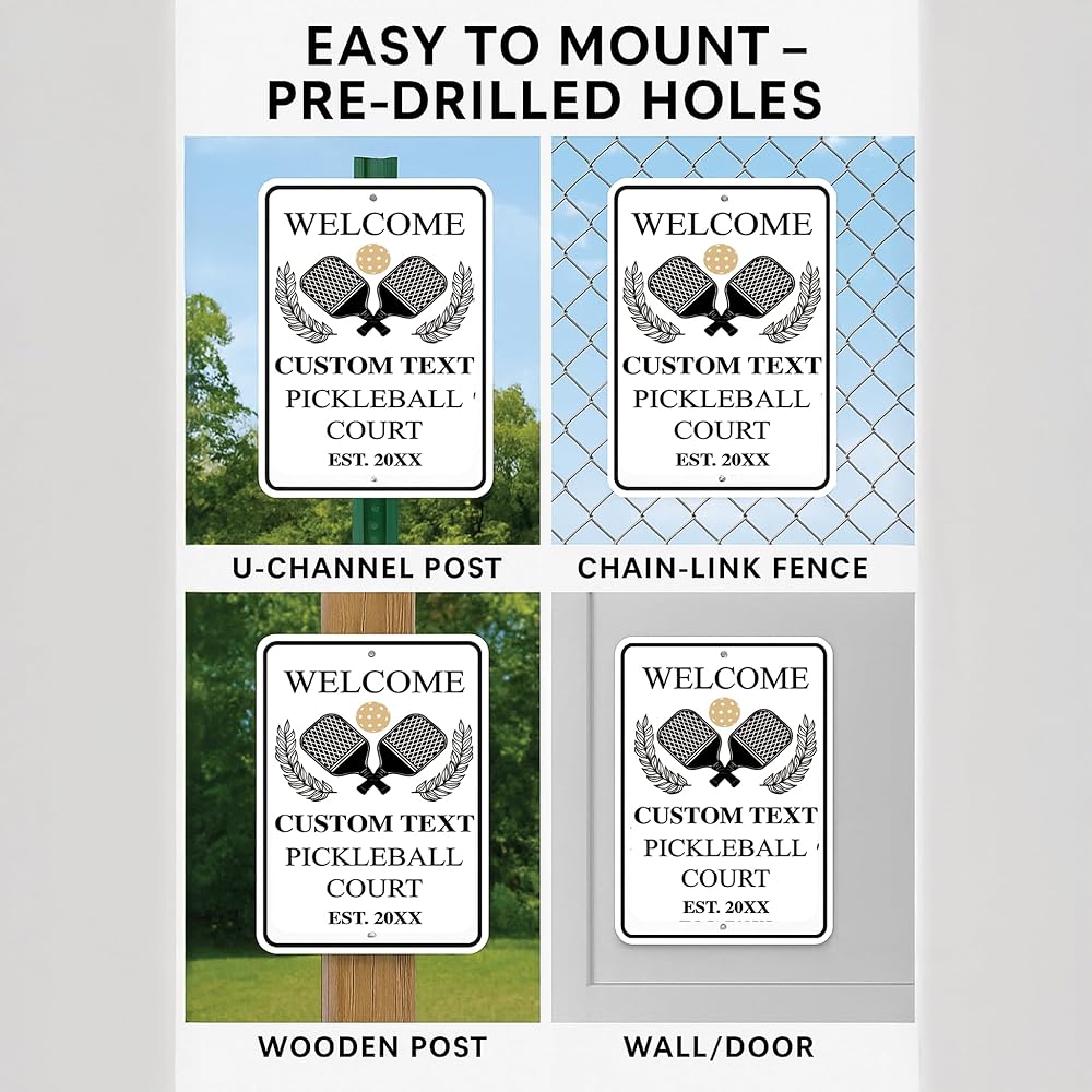 Welcome players in style with this Custom Pickleball Court Welcome Sign! Personalize it with your family name, club name, or custom text along with your establishment year to create the perfect finishing touch for your pickleball court. Crafted from premium aluminum, this sign is built to withstand outdoor weather conditions without rusting or fading. Featuring rounded, burr-free corners and two pre-drilled mounting holes, it's easy to install on U-channel posts, round or square galvanized posts, wooden posts, walls, doors, or chain-link fences. Perfect for home courts, private clubs, parks, or recreational facilities, this durable and stylish pickleball sign is both functional and decorative. Proudly designed and printed in the USA by VictoryStore, a family-owned business trusted for over 25 years in high-quality custom signage.