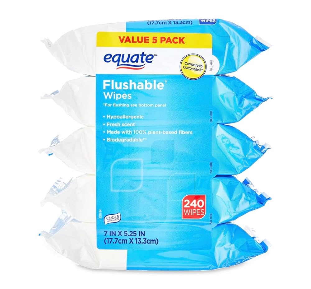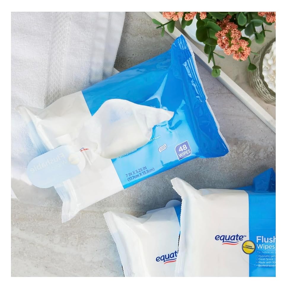 Equate Fresh Scent Flushable Wipes are better than dry bath tissue alone. Feel confident and refreshingly clean with these soft, fresh-scented flushable wipes. These flushable wipes are hypoallergenic and free of alcohol, phenoxyethanol, and parabens. They're also infused with vitamin E and aloe extract. This product contains five packages with 48 wipes each - totaling 240 wipes. The easy-to-use, resealable closure ensures the wipes stay moist and allows for easy access whenever you need them. Experience a new level of clean with these Equate Fresh Scent Flushable Wipes. Making the right health decisions can be challenging. With a complete range of products and simple solutions, Equate allows you to take care of your family with confidence.