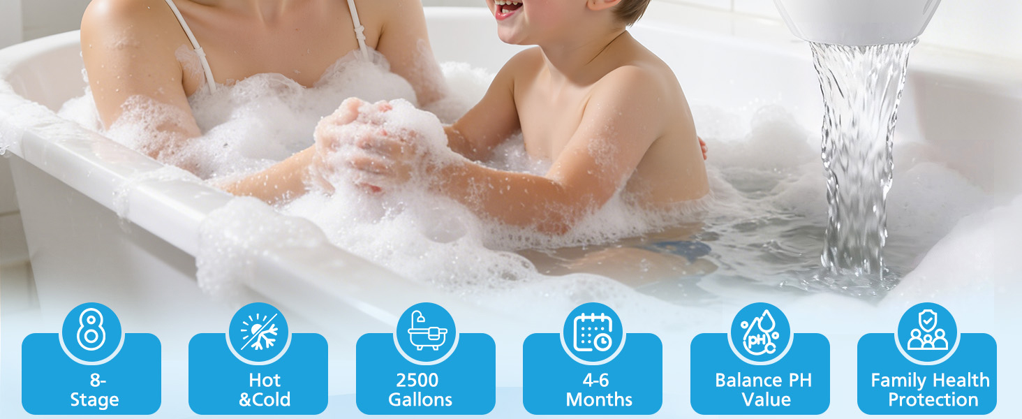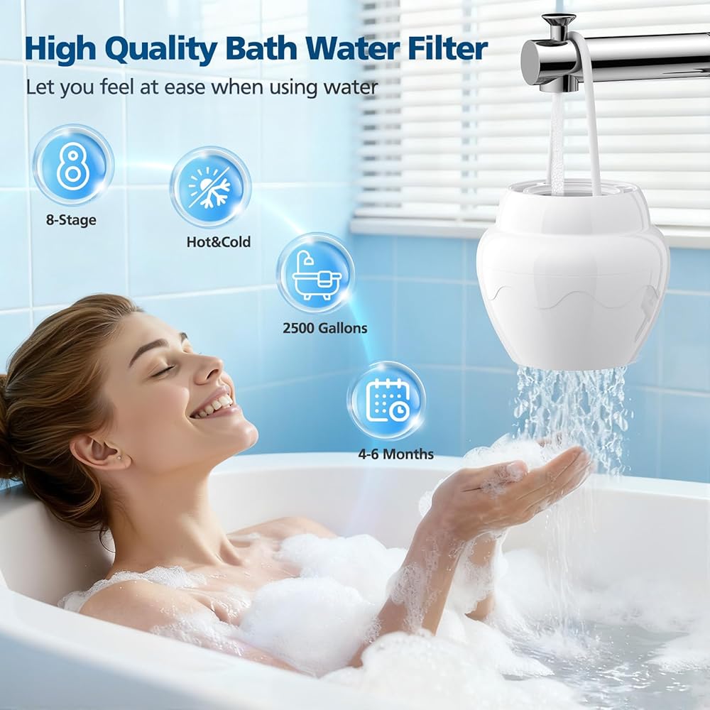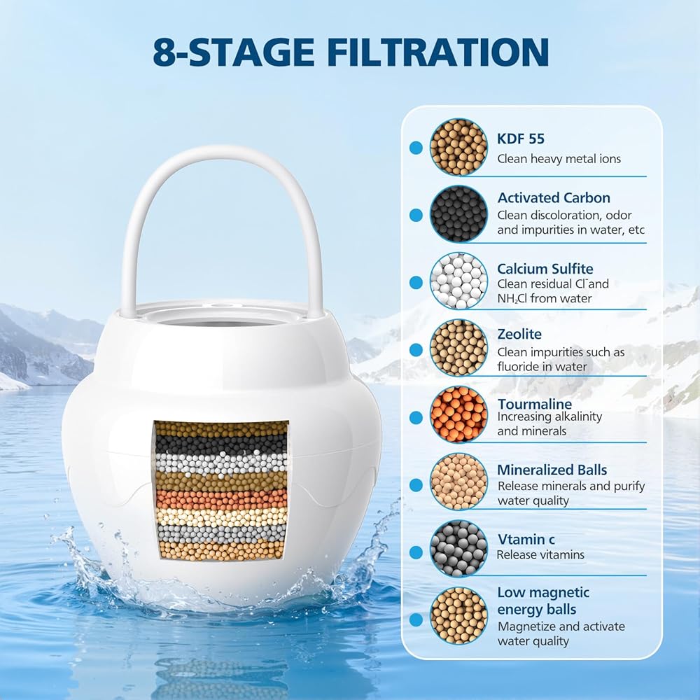ترشيح شامل بـ 8 مراحل: يستخدم نظام فلتر مياه حوض الاستحمام المتطور 8 طبقات مختلفة من وسائط الترشيح لاستهداف وتنظيف مجموعة واسعة من الملوثات بشكل فعال، بما في ذلك الكلور والفلورايد والمعادن الثقيلة والصدأ والرواسب والشوائب العضوية للحصول على مياه استحمام أكثر نظافة بشكل واضح وملمس.