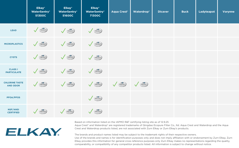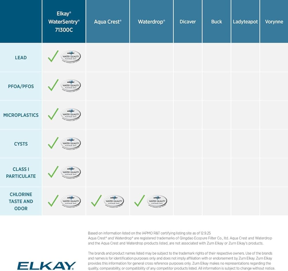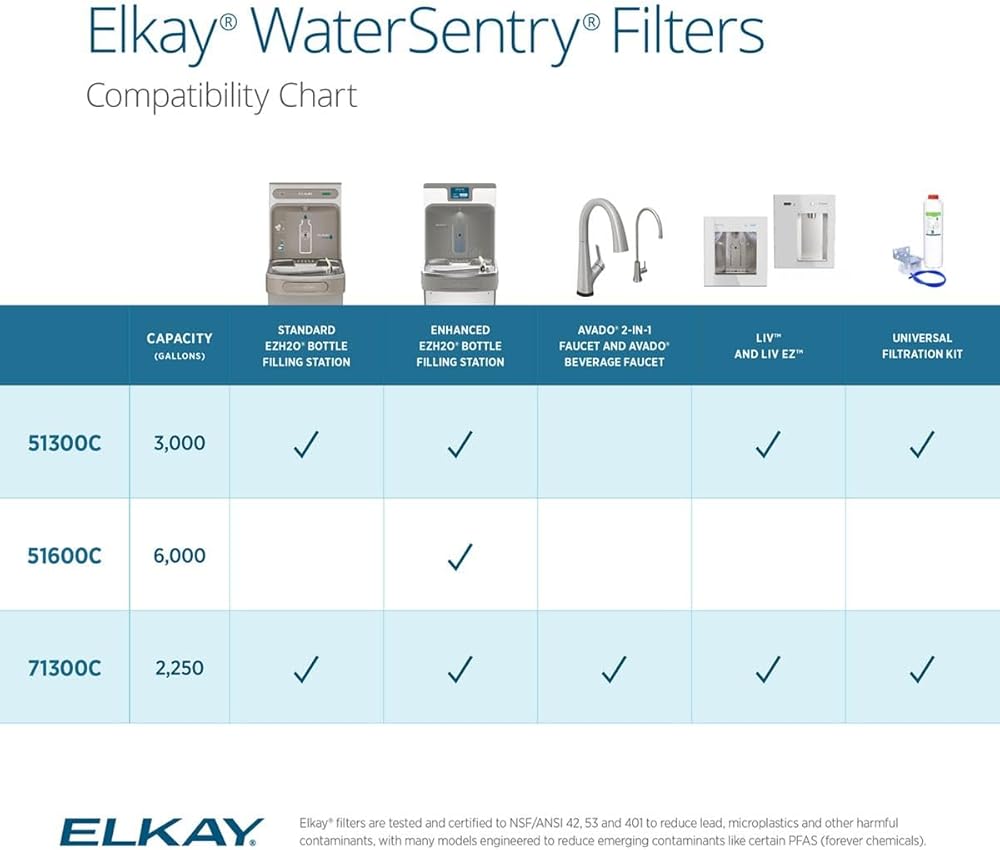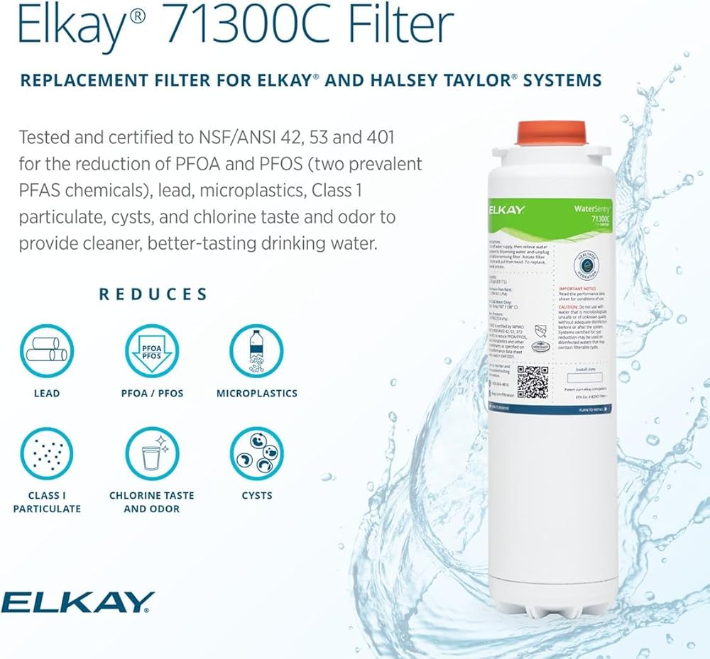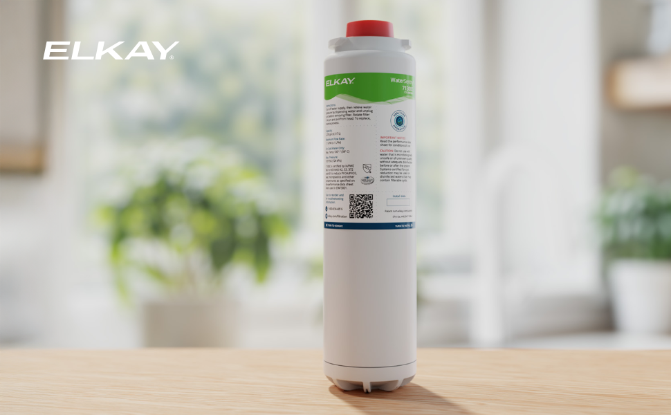 When you choose the Elkay 71300C WaterSentry, you're getting a genuine filter that's tested and certified for serious filtration. This filter is certified to NSF/ANSI 42, 53, and 401 to reduce PFAS chemicals (PFOA/PFOS), lead, microplastics, particles, cysts and chlorine taste/odor. With a 2,250-gallon filter life or 12-month usage, you benefit from fewer replacements and lower maintenance costs. The quick-disconnect 1/4-turn install makes swapping filters fast and clean, and the built-in automatic inlet shut-off prevents spills. Compatible with Elkay's enhanced bottle filling stations, water dispensers and also works with the EWF3001 universal filtration kit. Counterfeit and third-party filters may look similar but are not tested to these standards and may compromise performance. Genuine Elkay filters help ensure safe operation, maintain certification, and protect the long-term integrity of your equipment.