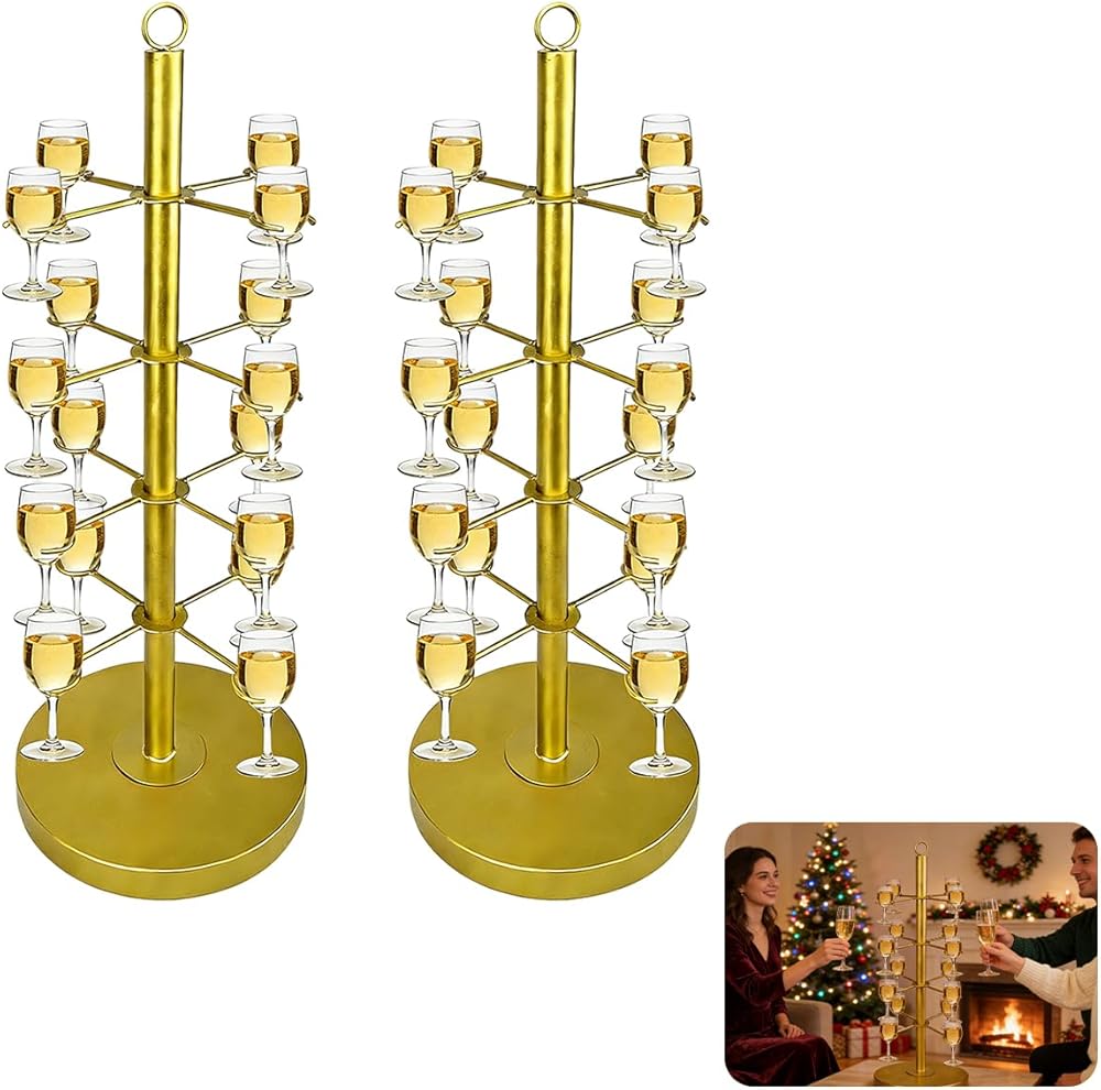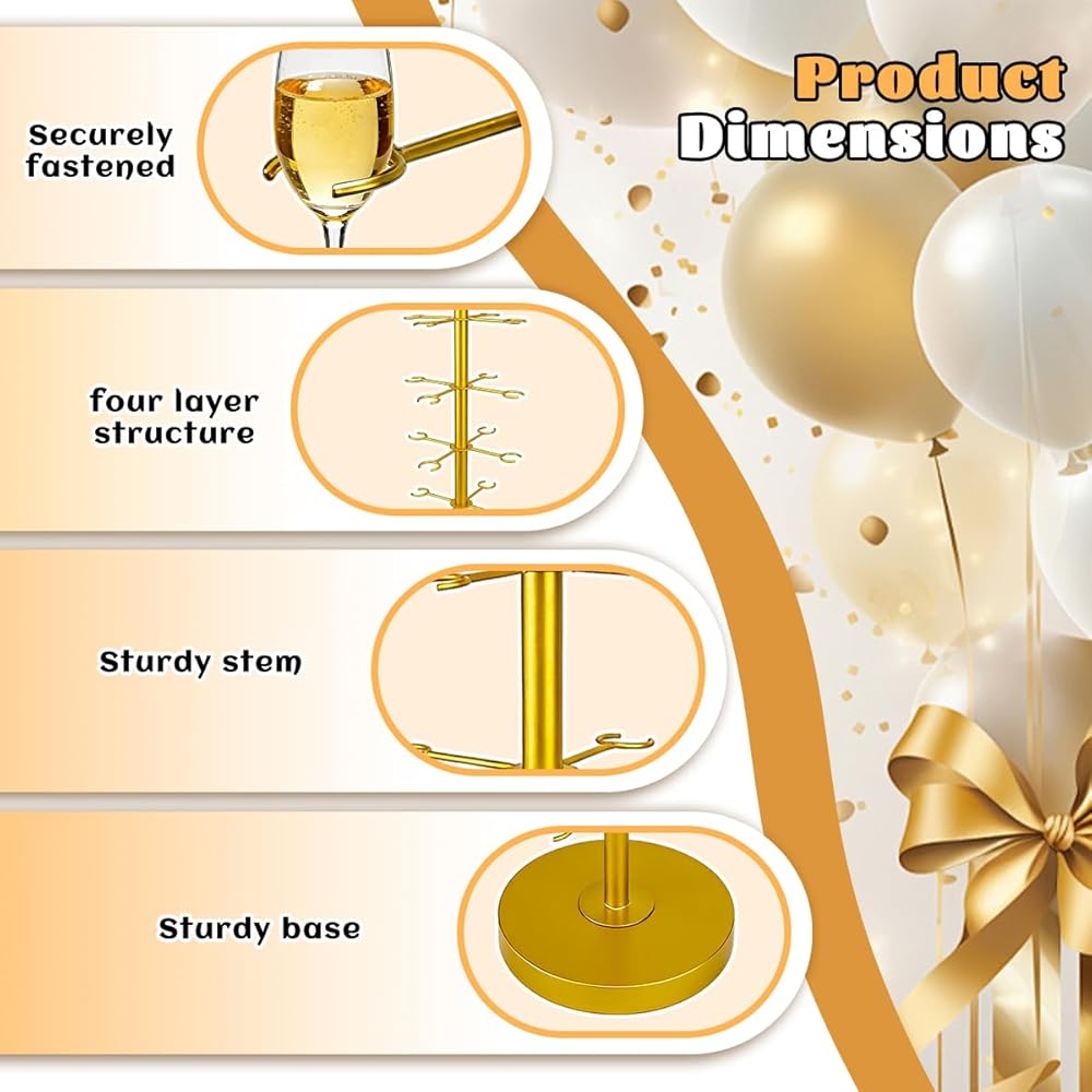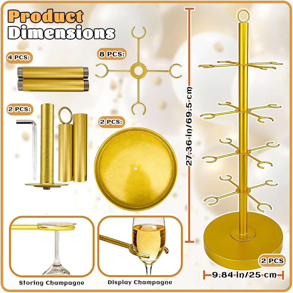 2 Piece Set for Large Gatherings: This champagne tower set includes 2 stands, each measuring approx. 27.36 inches in height and 9.84 inches in width. Featuring 4 tiers with 4 hooks per tier, a singlechampagne tree can hold up to 16 wine glasses allowing the 2-piece set to serve 32 people at once, ideal for big events.