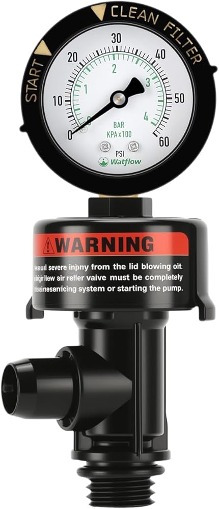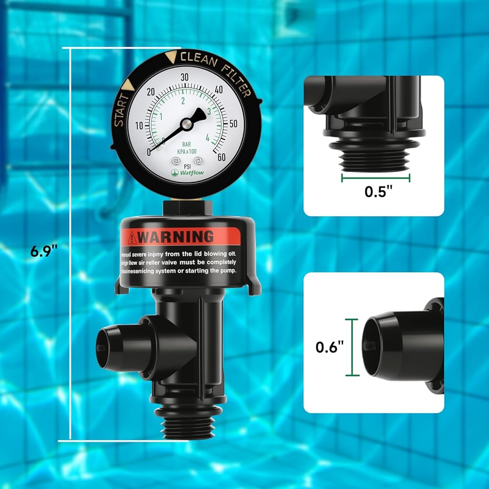 Integrated shockproof pressure gauge can monitor the filter pressure in real time to prevent the system from overload risk.High-flow manual relief valve design can quickly release the air accumulated in the swimming pool filter, solve the air lock problem and improve the efficiency of the water pump.