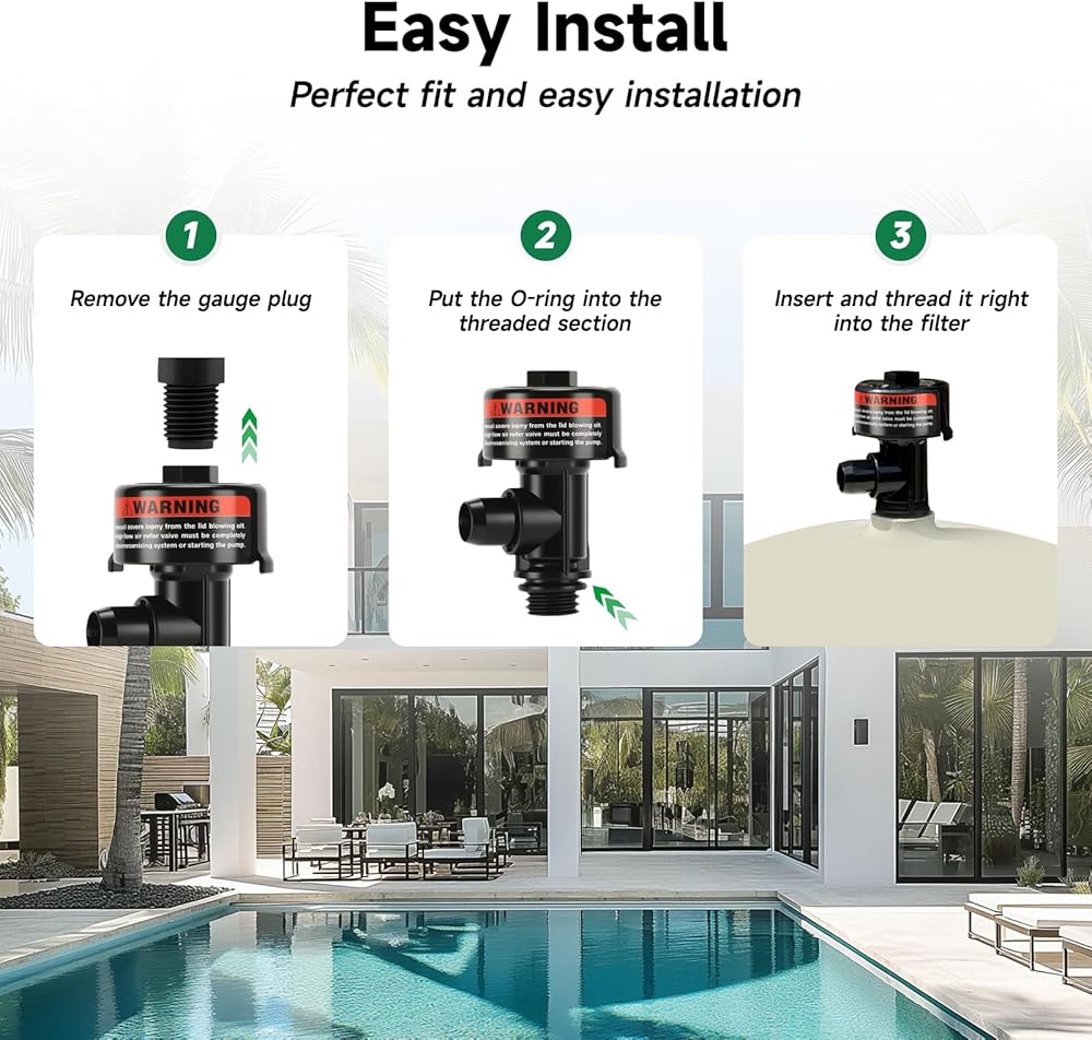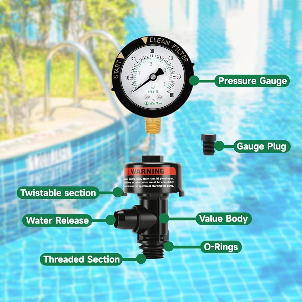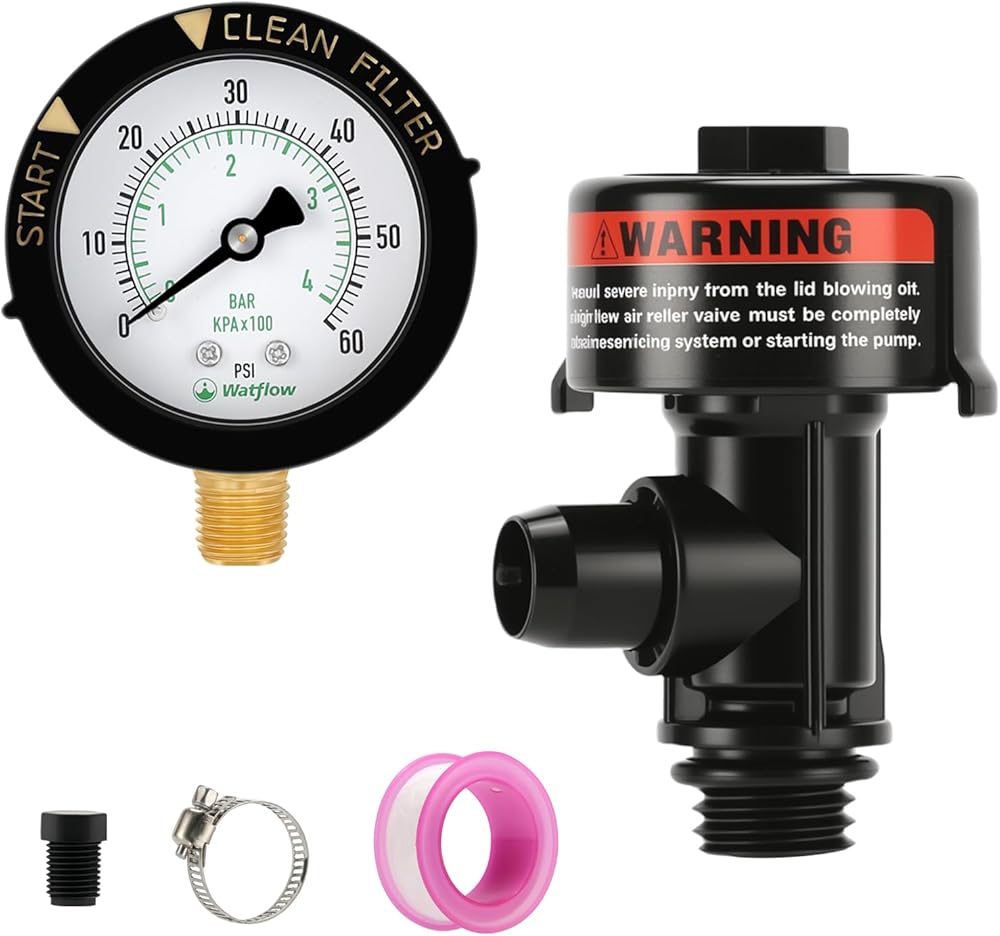 The air relief valve package includes a pressure relief valve, pressure gauge, gauge plug, tape, hose clamp, and user manual.Simple twist mechanism allows for quick air release from pool and spa filter systems when needed