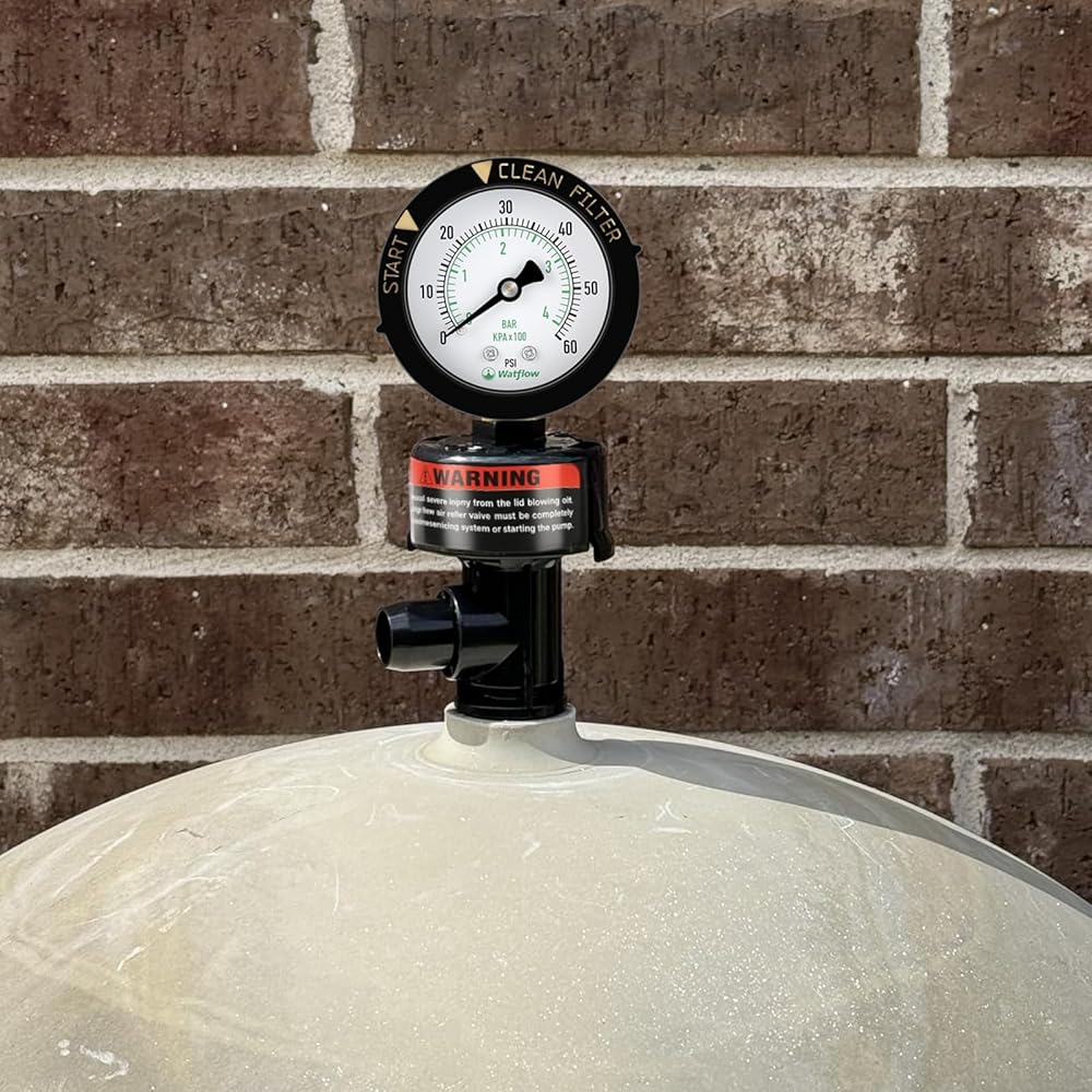 Removing the old pool filter pressure gauge and air relief valve, and connect the new pool valve assembly to the device by thread. Just make sure that Teflon tape is attached to the pressure gauge of the swimming pool filter.