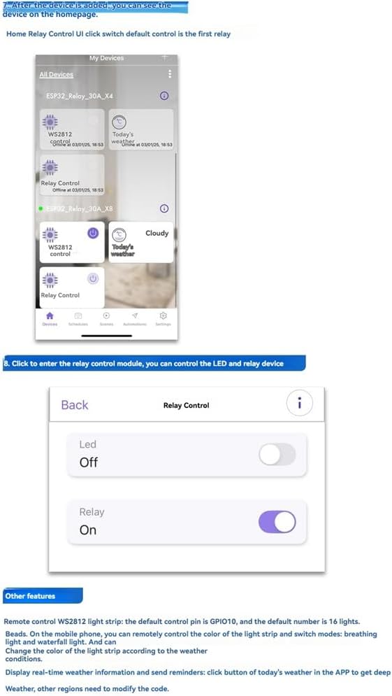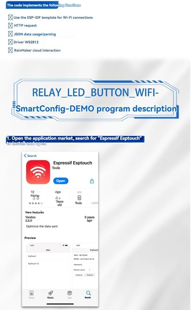 4. Provide SDK ESP-IDF code. After burning the program, you can directly remotely control the onboard LED and relay with your mobile phone, and have functions such as WiFi network configuration and factory reset (contact customer service)
