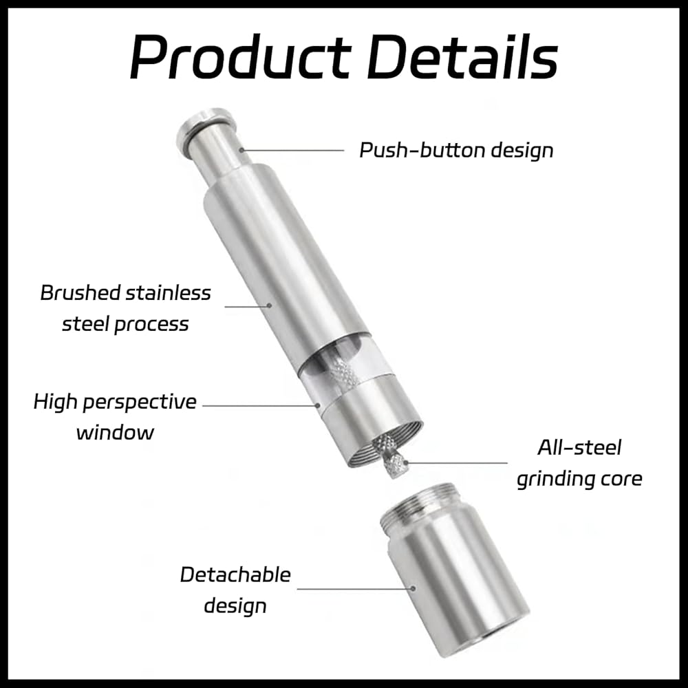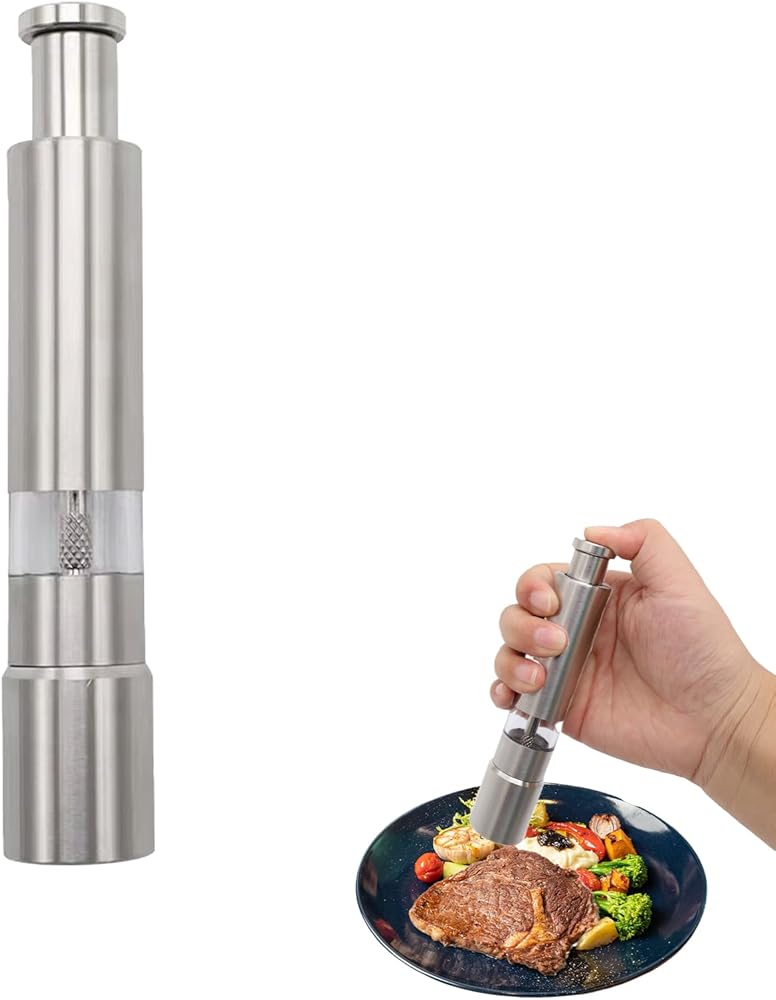 Material: Stainless Steel Farbe: Silver Size: 15.4cm Das Paket Beinhaltet: 1 Package Contents: 1 Push Button Salt And Pepper Grinder, Perfect For Your Everyday Needs. High Quality And Durability: The Push Button Salt And Pepper Grinder Features A Stainless Steel Grinding Mechanism For Long-Lasting Use, Adding A Touch Of Elegance To Your Kitchen. Refillable: The Salt And Pepper Grinder Is Refillable, Allowing You To Use Your Favorite Salt And Pepper Varieties. It Pairs Perfectly With Himalayan Salt And Features An Adjustable Coarseness For Easy Seasoning Customization. One-Handed Operation: The Salt And Pepper Grinder Features A User-Friendly One-Touch Pump Button, While Our Carefully Designed Grinding Rod Ensures Efficient Grinding. Simply Press The Button On Top, And Our Grinder Will Do The Rest! Versatile: Perfect For All Your Seasoning Needs; Perfect For Cooking In The Kitchen Or Grilling Outdoors In The Backyard Or At The Park! The Push Button Salt And Pepper Grinder Also Makes A Great Gift For Chefs, Foodies, Adults, And Those Who Cook Every Day!