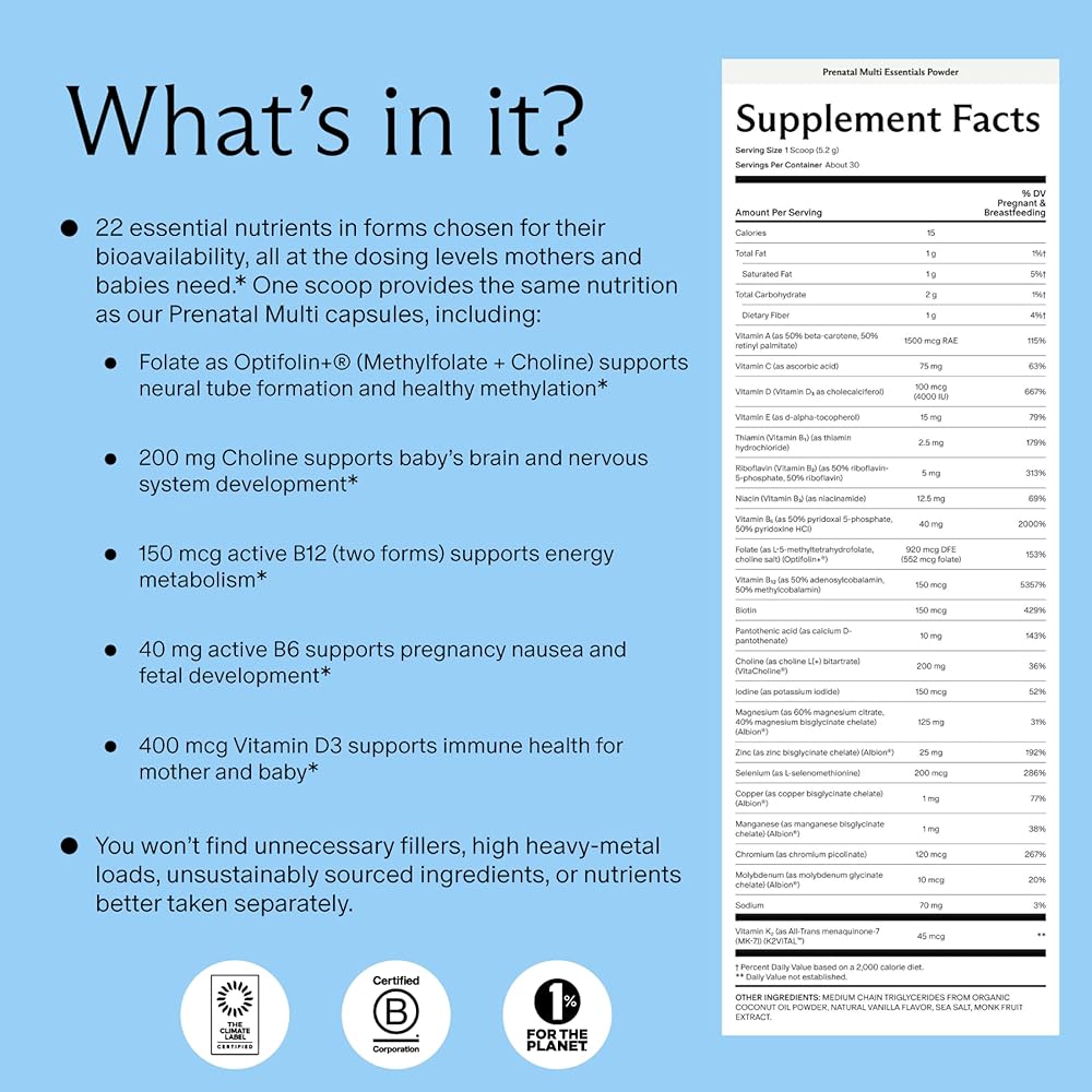 ضروري. مسحوق الفيتامينات المتعددة مع الكولين قبل الولادة - لمرحلة ما قبل الولادة، والحمل، والرضاعة الطبيعية، وبعد الولادة | تمت صياغته بخبرة وتم اختباره بواسطة طرف ثالث | نكهة الفانيليا، كمية تكفي لمدة 30 يومًا