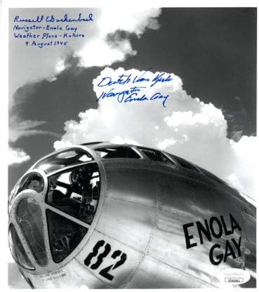 Theodore Dutch Van Kirk was a navigator in the United States Army Air Forces best known as the navigator of the Enola Gay when it dropped the first atomic bomb on Hiroshima Russell Gackenbach served as a 2nd Lieutenant in the 393rd Bombardment Squadron and in the 509th Composite Group He flew in the Necessary Evil during the August 1945 Hiroshima bombing mission and in the Enola Gay during the Nagasaki bombing mission On August 6 1945 Gackenbach was a navigator aboard Necessary Evil one of two B29s that accompanied the Enola Gay Dutch Van Kirk and Russell Gackenbach have both hand signed this 8x10 Photo with Navigator Enola Gay Weather Plane Kokura 9 August 1945 inscriptions JSA Hologram NoEE63501 and JSA Certificate of Authenticity Features. Dutch Van Kirk Russell E Gackenbach Signed WWII Photo. Navigators Enola Gay Hiroshima Kokura 9 Aug 1945 with JSA NoEE63501Specifications. Color Black White. Size 8 x 10 in