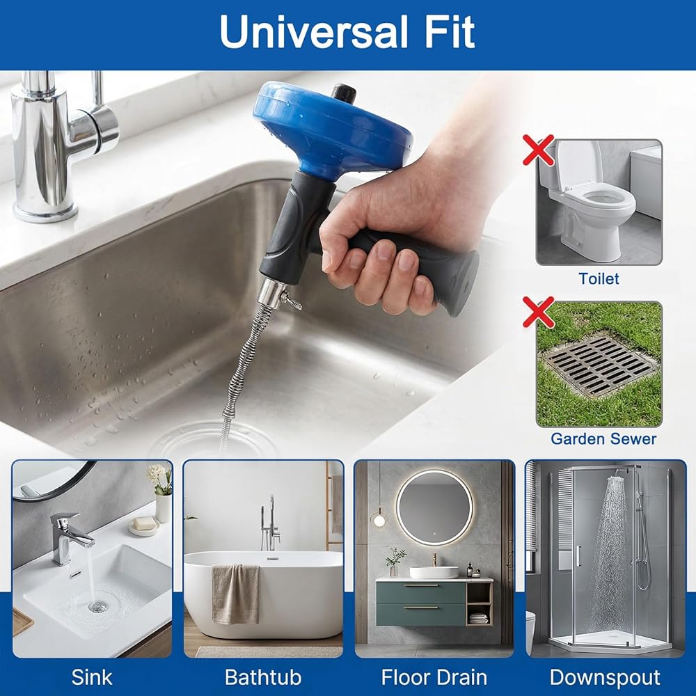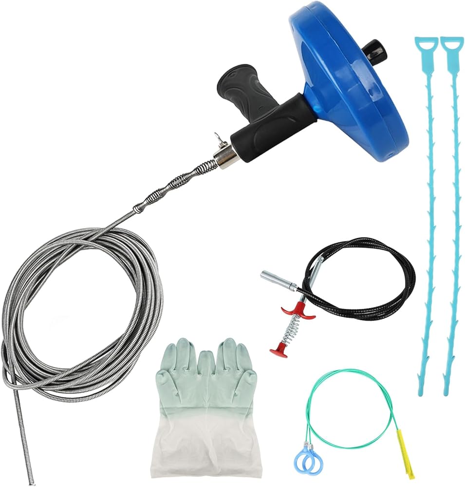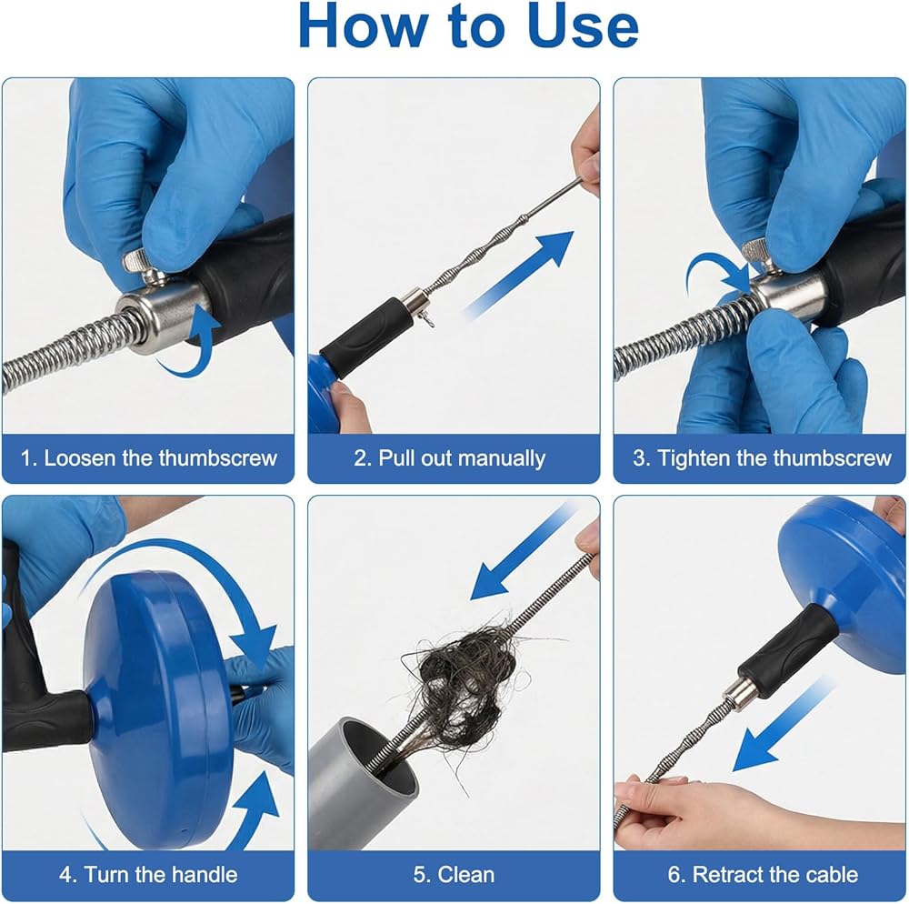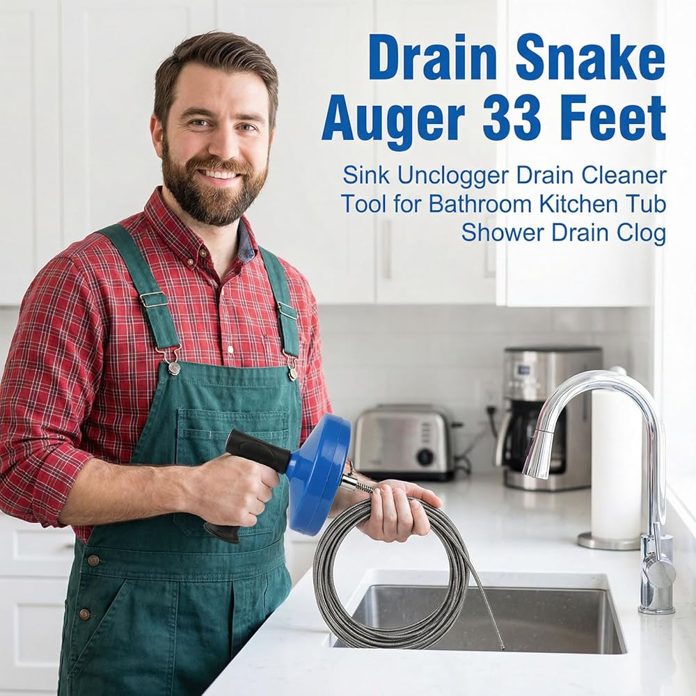 Product Name: Drain Snake Auger Tool Application: Capable of handling kitchens, bathrooms, utility sinks, bathtubs, showers, sewers, and floor drains. Note: Not for use in toilets, as porcelain damage will occur. Cable Length: 33 Feet Package Includes: 1 x Drain Snake Auger 1 x 33Ft Drain Auger Cable 1 x Hair Removal Tool 2 x Cleaning Brush 2 x Drain Clog Remover 1 x Gloves Reusable Drain Auger: The drain auger effortlessly clears clogged drains. It effectively tackles sink clogs, which are usually caused by grease. You can use it for long periods of time, saving time and effort. Here's how to use the manual drain snake auger set: Prepare the Snake: Loosen the thumbscrew and feed the coiled metal snake into the clogged drain. Stop when it can't go any deeper, which means you've reached the blockage. Secure the Snake: Secure the snake to the drain opening by tightening the thumbscrew to keep it stable during operation. Clear the Clog: Press the red handle firmly against the drain. Then, repeatedly pull the lever on the handle. Clean and Maintain: Pull the snake out and rinse it with water. Then, apply a small amount of engine or food oil to avoid rust before storage.