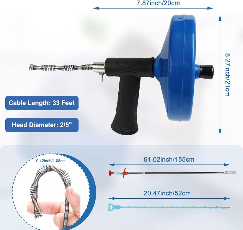 [Flexible Steel Cable] The 33ft plumbing snake is made of heavy-duty spring steel and is designed to tackle clogs. This effective drain auger is long enough to unclog drains and ensure that water flows smoothly