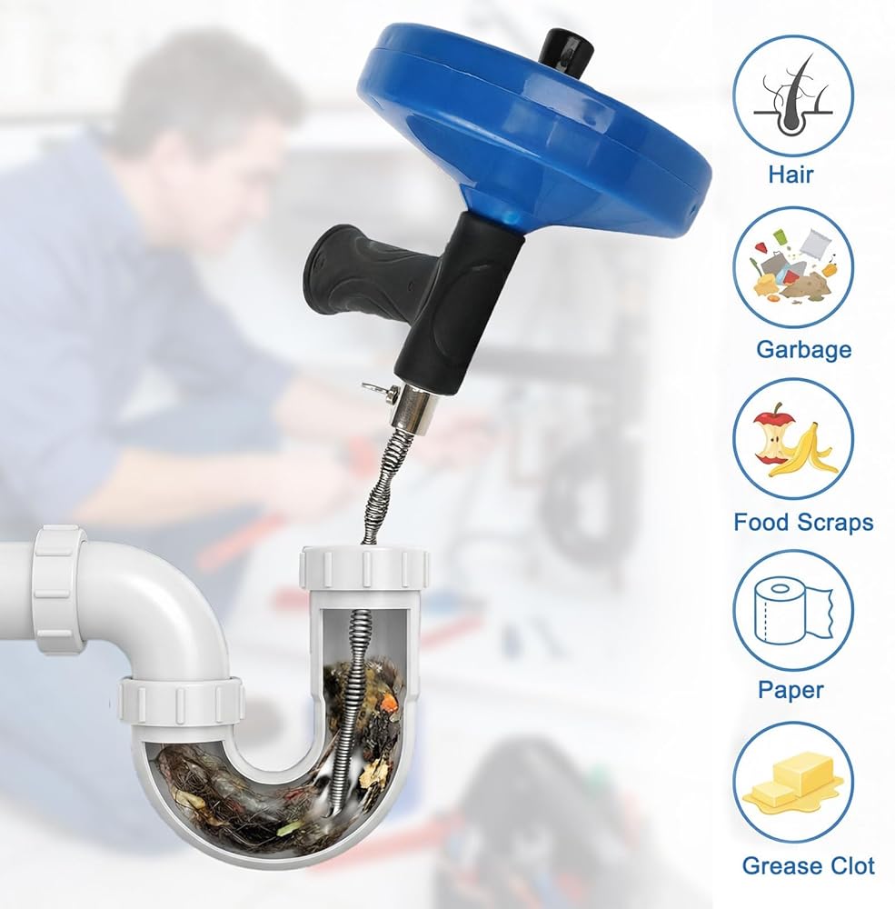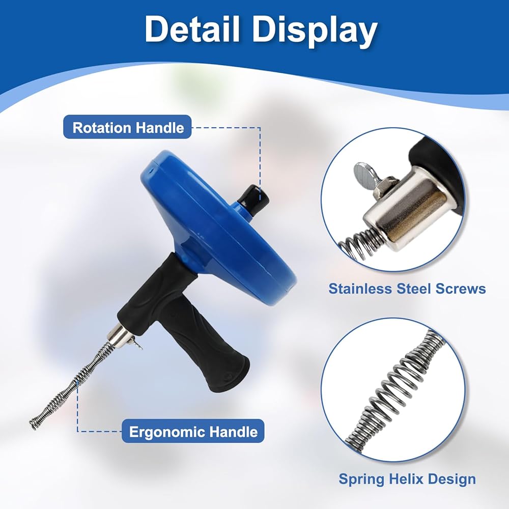 [Easy Operation] The drain snake auger features an ergonomic pistol grip for simplified use and more comfortable handling. The cable's flexible spring can bend more than 90 degrees without breaking or kinking. This allows you to efficiently reach sink clogs