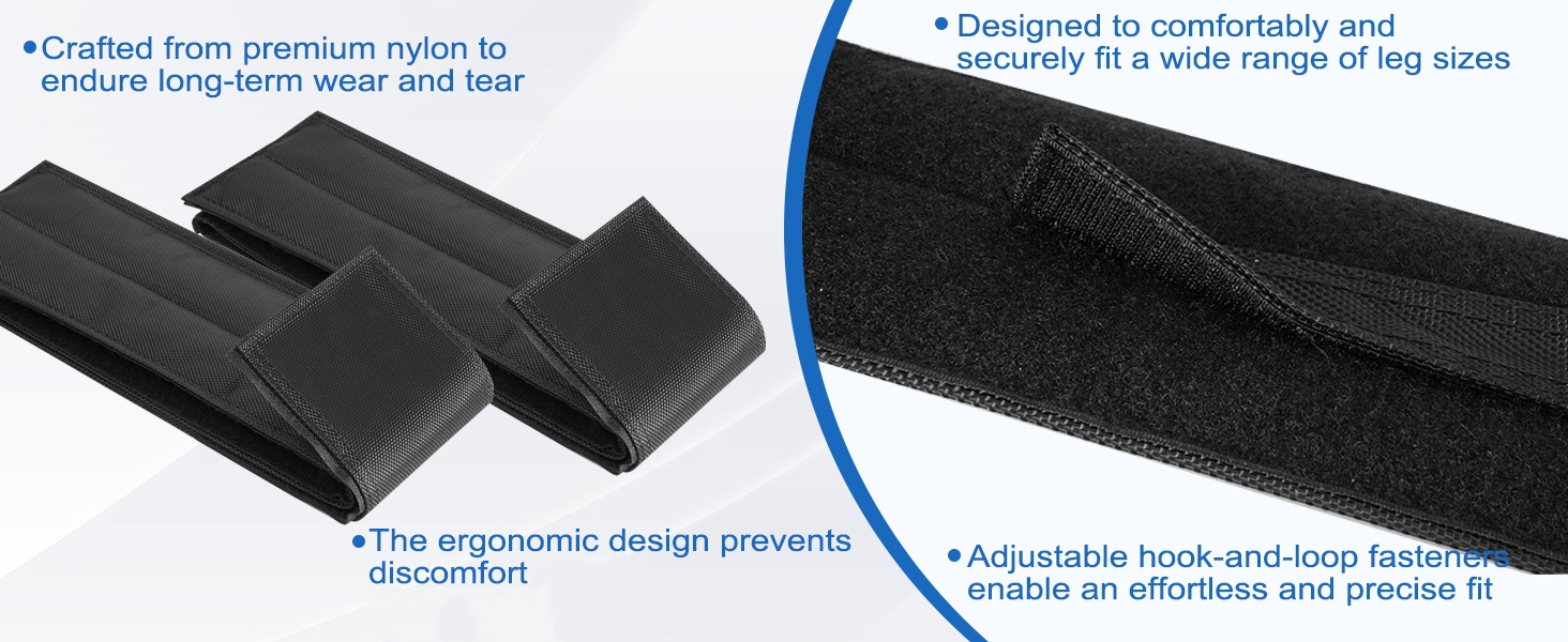 ملاءمة آمنة وقابلة للتعديل: تتميز بمشابك فيلكرو قوية، تتيح الأشرطة تثبيتًا سريعًا وآمنًا مع السماح بتعديلات دقيقة. إنها تناسب جميع أحجام الأرجل بشكل مثالي وتبقى ثابتة في مكانها، مما يوفر الثبات والأمان على أي ركائز للجدران الجافة