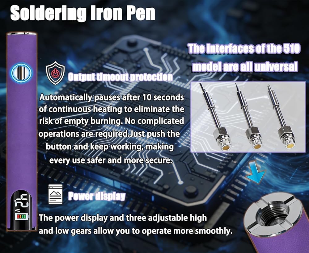 1. التوافق العالمي مع الخيوط 510 استمتع بتجربة التنوع المطلق مع الخيوط 510 المتوافقة مع معايير الصناعة، والتي تم تصميمها للتواصل بسلاسة مع مجموعة واسعة من أطراف اللحام والملحقات. يضمن هذا التصميم العالمي توافقًا سهلاً للمهام الدقيقة مثل إصلاح لوحة الدائرة ولحام المجوهرات وربط الأسلاك وإنشاء الأعمال الفنية الدقيقة. قم بتبديل الملحقات على الفور للتعامل مع المواد المتنوعة - من الإلكترونيات إلى البلاستيك - مع ثبات وتحكم لا يتزعزع، مما يجعلها الأداة المفضلة لكل من مشاريع الأعمال اليدوية المعقدة والإصلاحات الاحترافية.
