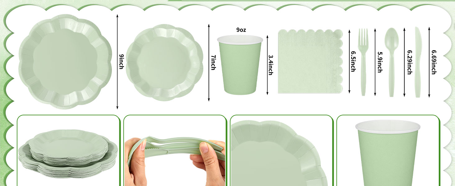 【تصميم صدفي】تتميز مجموعة الأطباق الورقية باللون الأخضر المريمية بتصميم دانتيل صدفي فريد من نوعه، وهو ليس أكثر رواية فحسب، بل أيضًا زخرفيًا، مما يضيف الأناقة والجمال إلى طاولة الطعام الخاصة بك، مما يجعل جو حفلتك أكثر تقدمًا وإبداعًا.