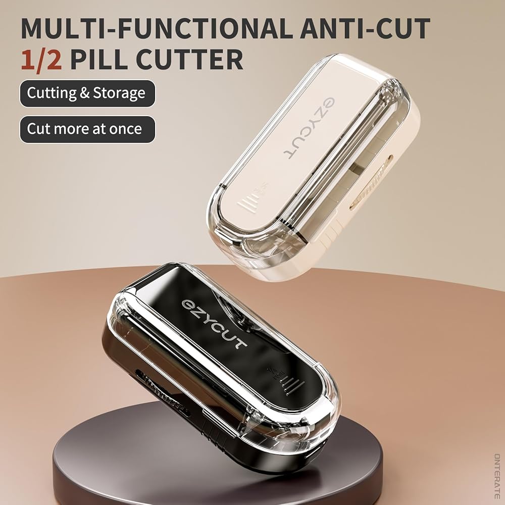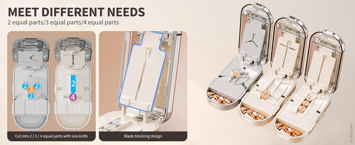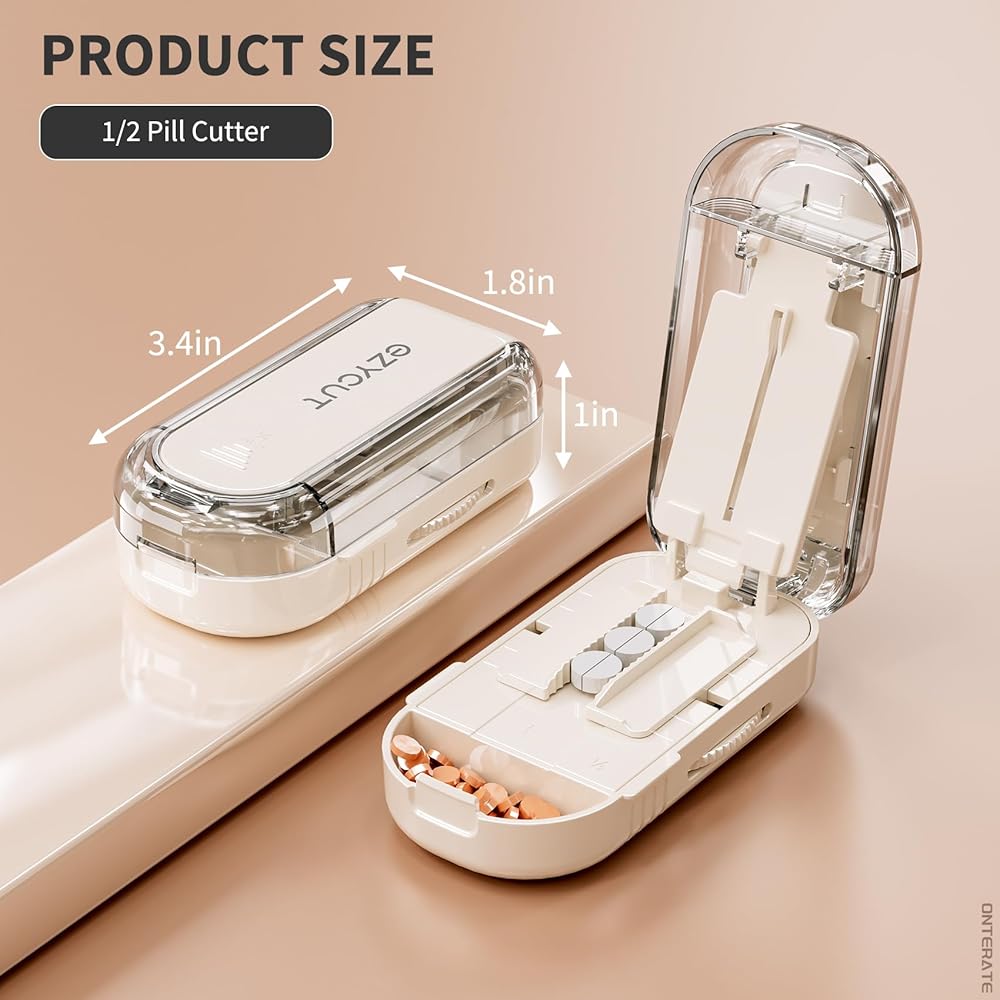 مقسم حبوب منع الحمل من ONTERATE للحبوب الصغيرة والكبيرة، مقسم حبوب قابل للتعديل مع شفرة أمان مخفية من الفولاذ المقاوم للصدأ، قاطع فيتامين للسفر إلى 1/2 (كريمي)