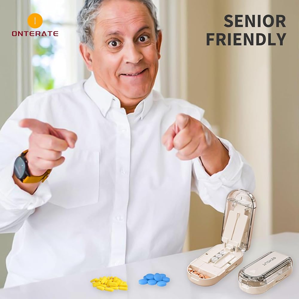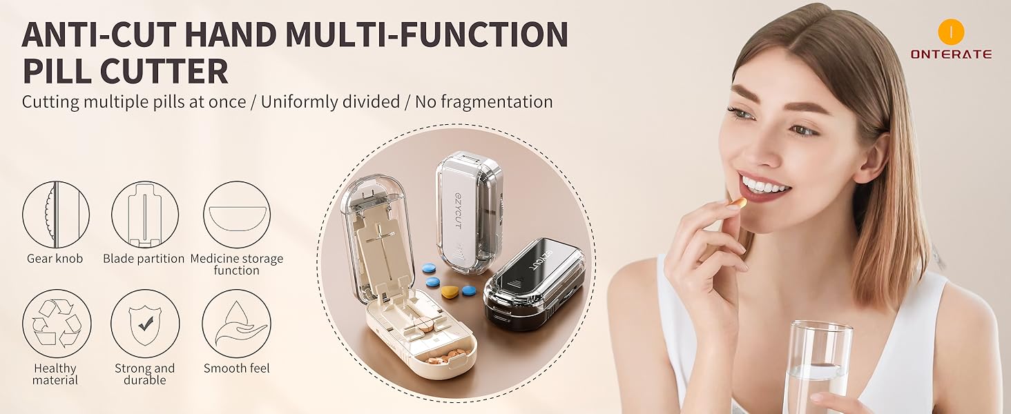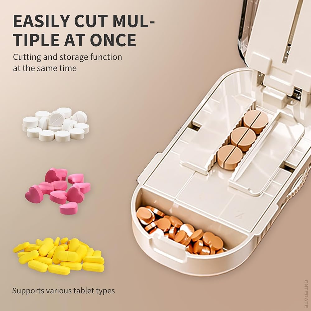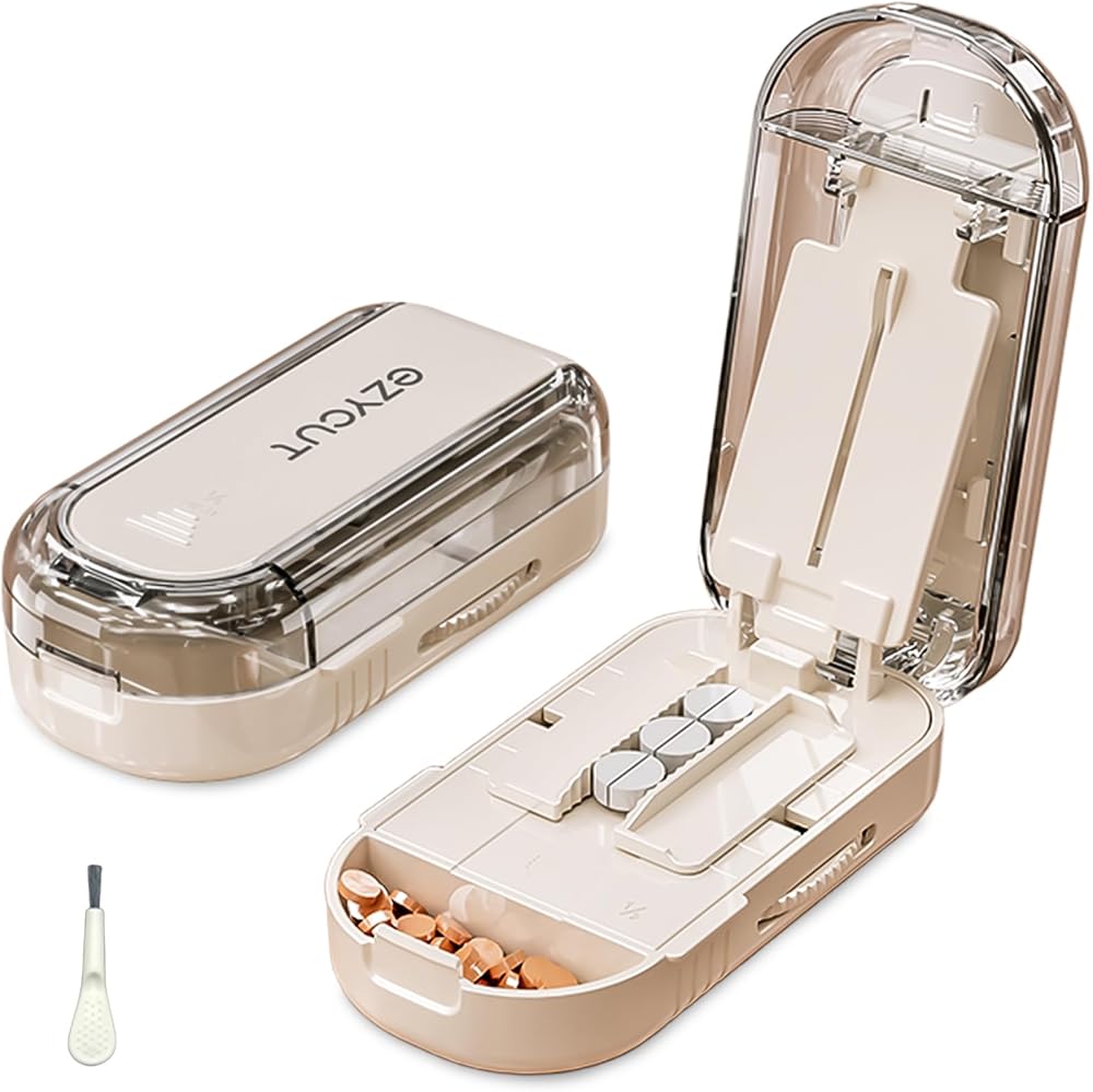 مقسم حبوب منع الحمل من ONTERATE للحبوب الصغيرة والكبيرة، مقسم حبوب قابل للتعديل مع شفرة أمان مخفية من الفولاذ المقاوم للصدأ، قاطع فيتامين للسفر إلى 1/2 (كريمي)