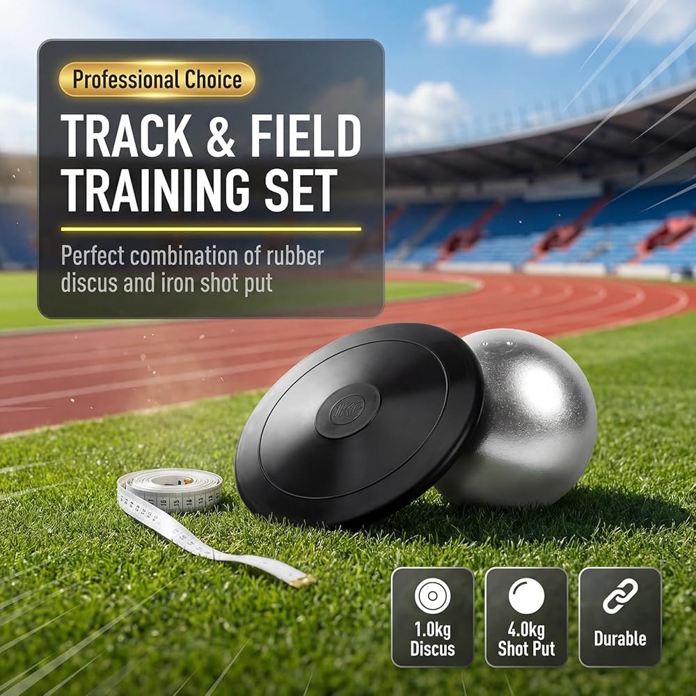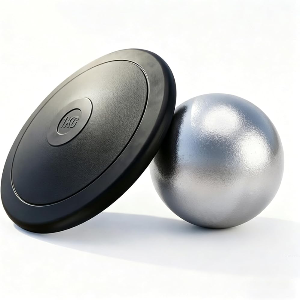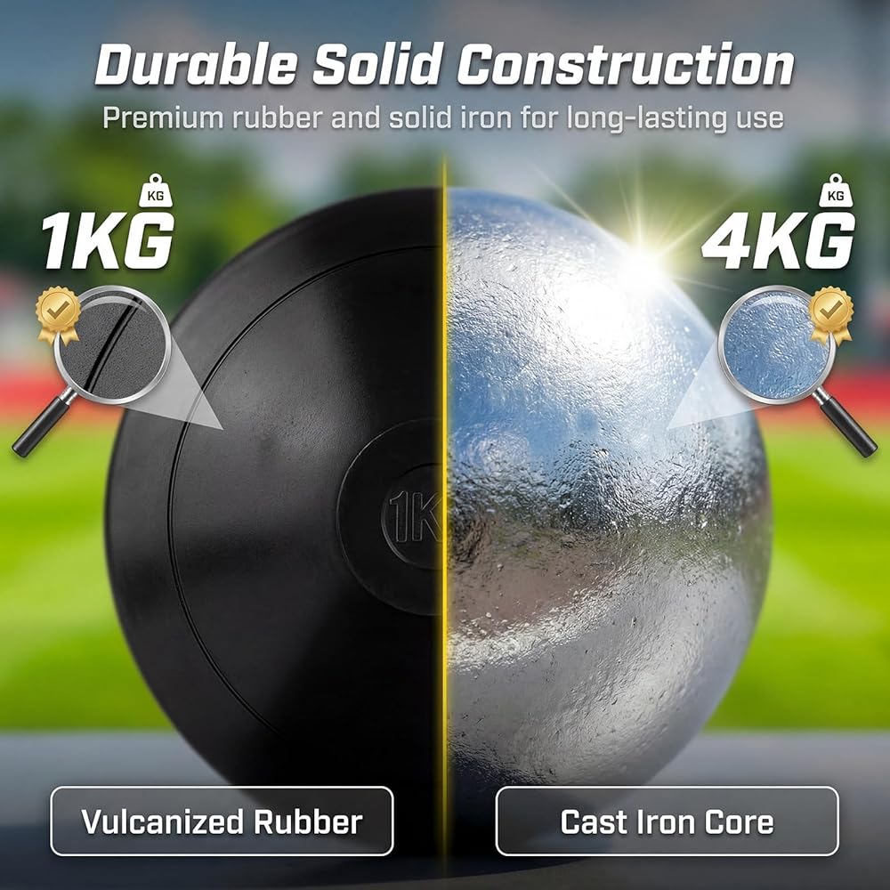 مادة متينة وعالية الجودة - رمي اللقطة بوزن 8.8 رطل مصنوع من حديد الزهر الصلب مع لمسة نهائية مقاومة للطقس، قرص بوزن 1 كجم مصنوع من مطاط مرن مضاد للانزلاق؛ كلاهما يتحمل التدريب الداخلي/الخارجي طويل الأمد دون تشوه أو تآكل.