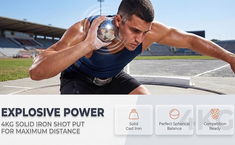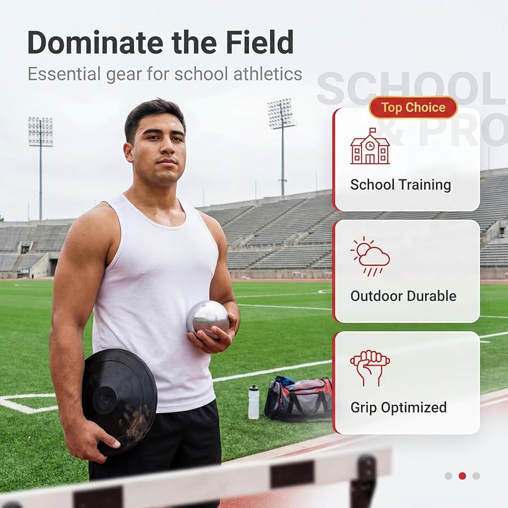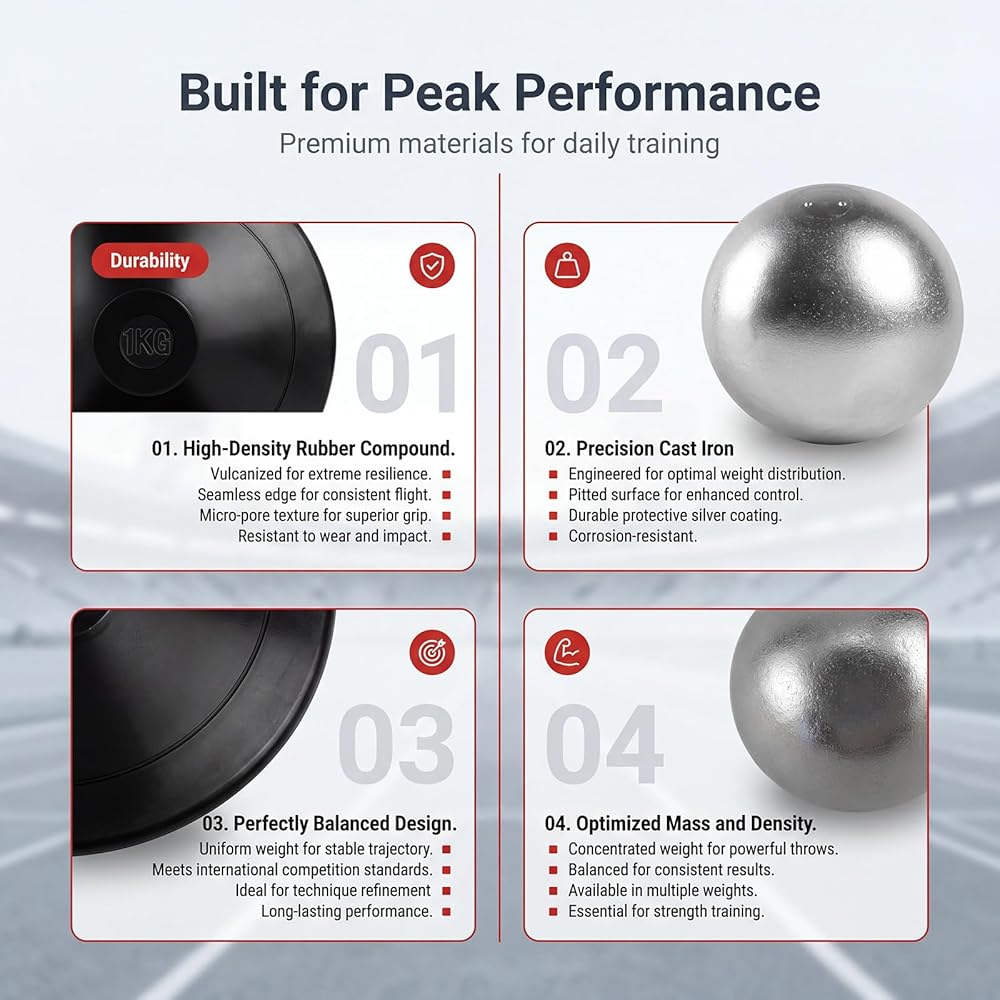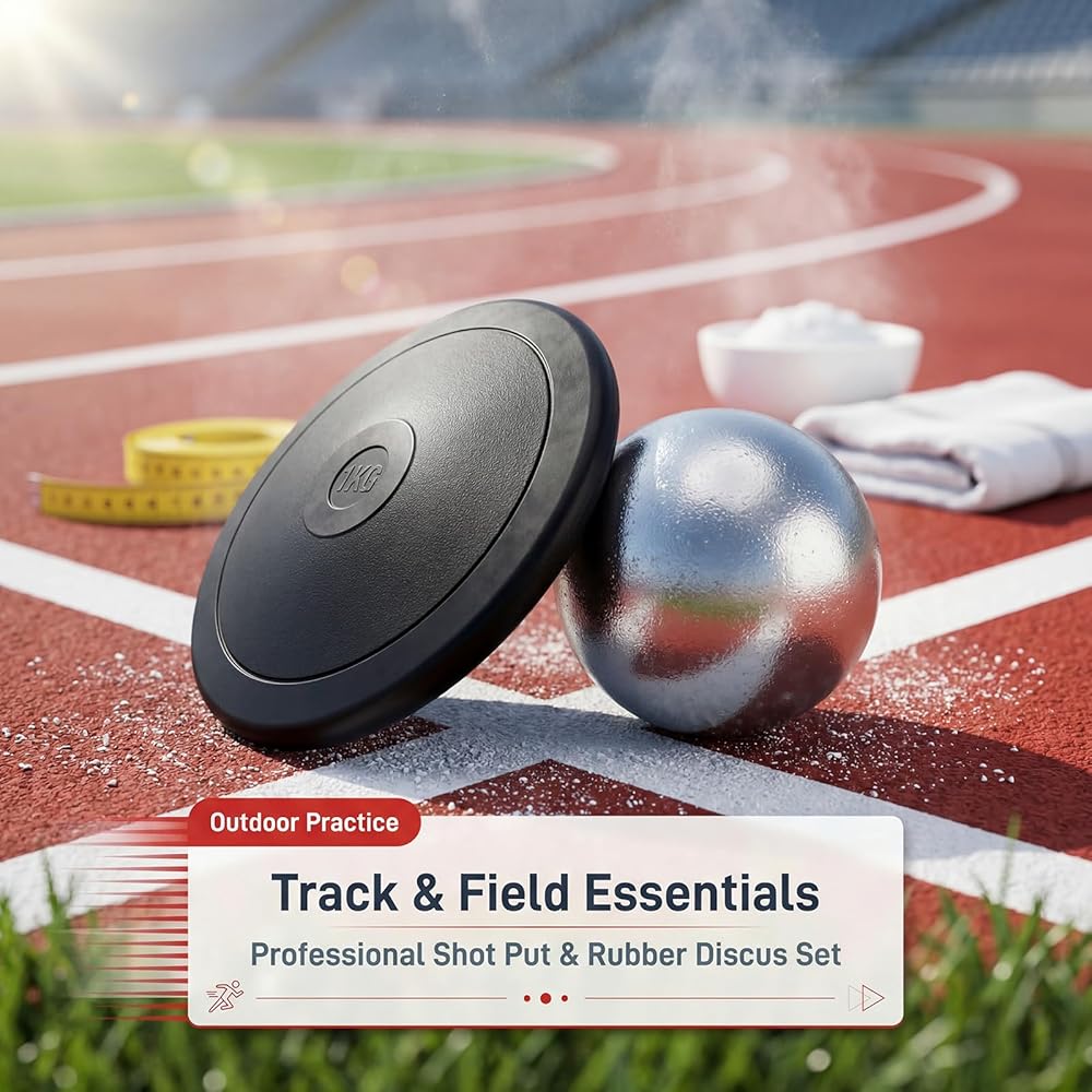 مادة متينة وعالية الجودة - رمي اللقطة بوزن 8.8 رطل مصنوع من حديد الزهر الصلب مع لمسة نهائية مقاومة للطقس، قرص بوزن 1 كجم مصنوع من مطاط مرن مضاد للانزلاق؛ كلاهما يتحمل التدريب الداخلي/الخارجي طويل الأمد دون تشوه أو تآكل.