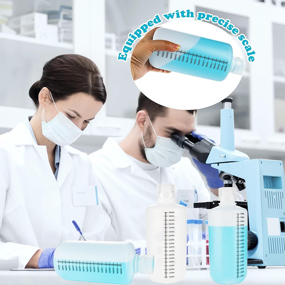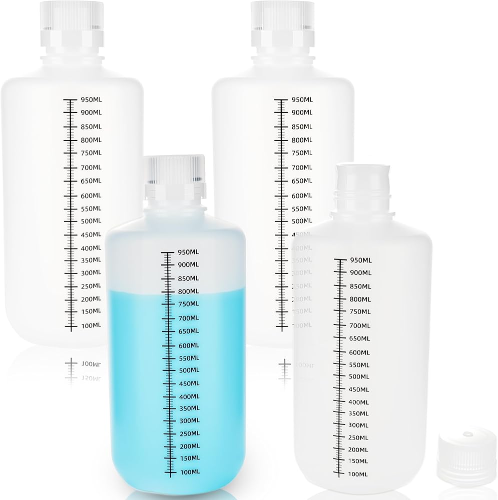 4 Pcs Narrow Mouth Plastic Lab Bottle 32 OZ/ 1000 ML PP Translucent Grade Graduated Reagent Bottle with Cap for Laboratory Chemicals Liquid Drugs Pill Sample Medicine Water Storage