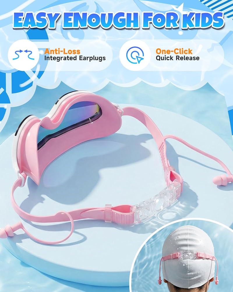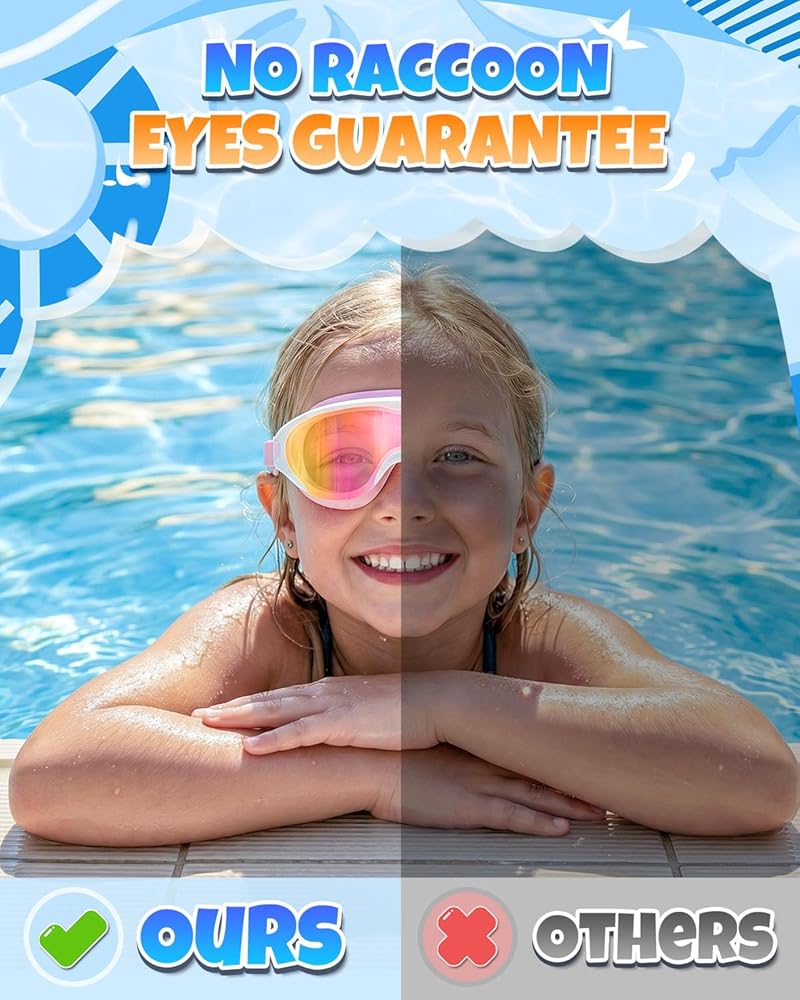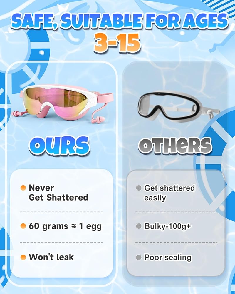 【COMFORT & SAFETY】These kids swimming goggles feature soft, hypoallergenic silicone cushions for a secure, comfortable fit. The 100% latex-free frames relieve skin pressure and create a reliable waterproof seal, protecting children from chlorine irritation and preventing raccoon eyes.