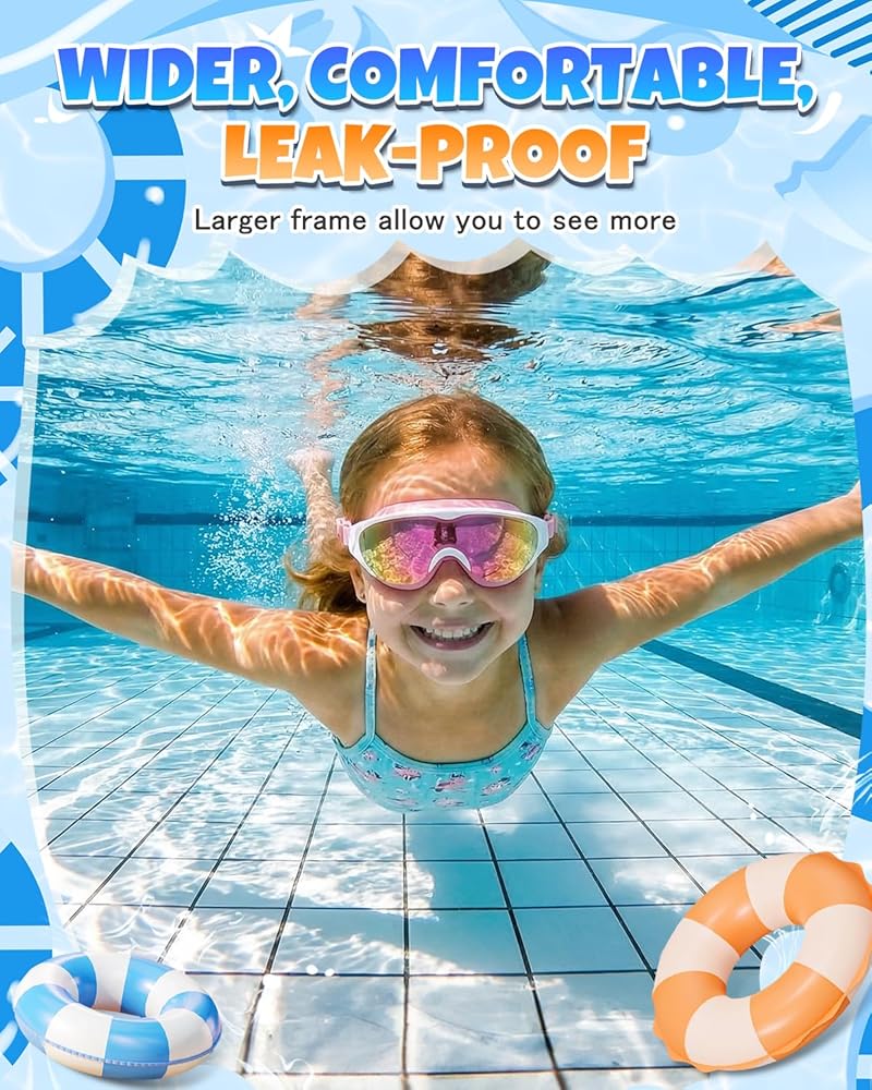 【UV PROTECTION】Lenses are treated with UV-absorbing technology to block harmful ultraviolet rays, safeguarding your child's eyes during outdoor swimming. Ideal for boys and girls to explore underwater confidently during swimming lessons, pool play, or beach activities.