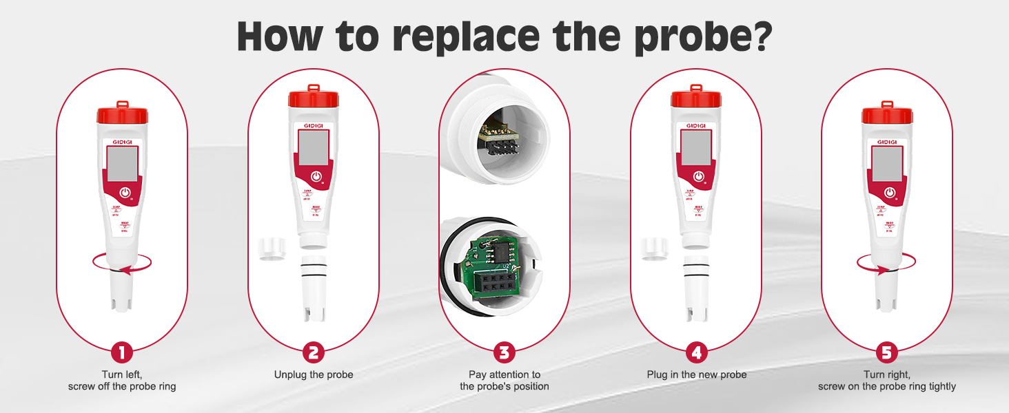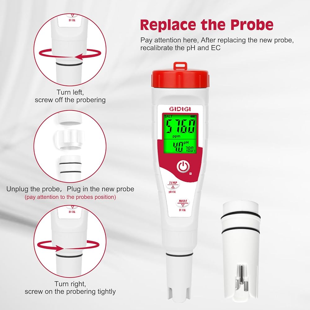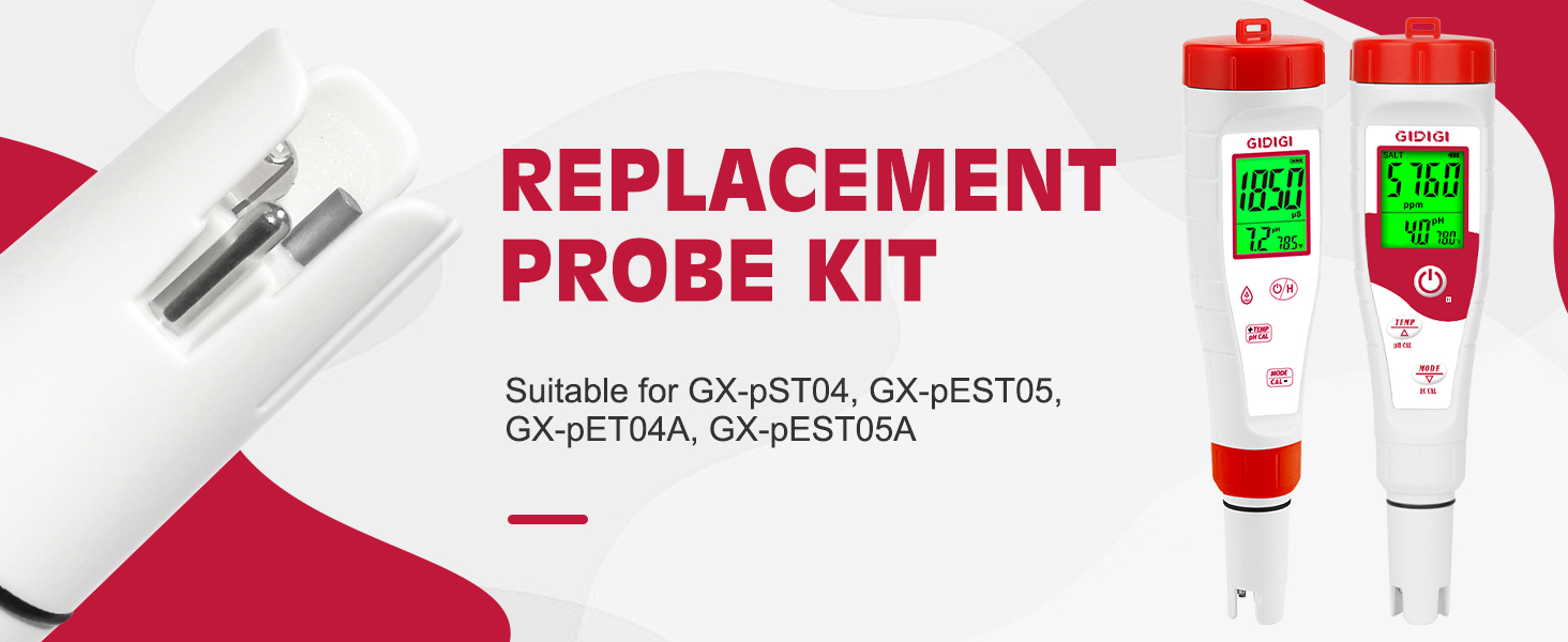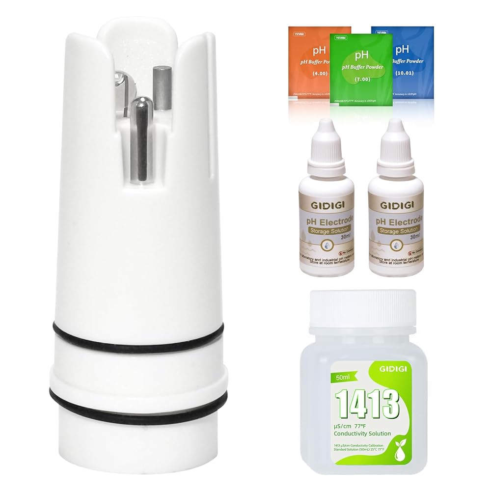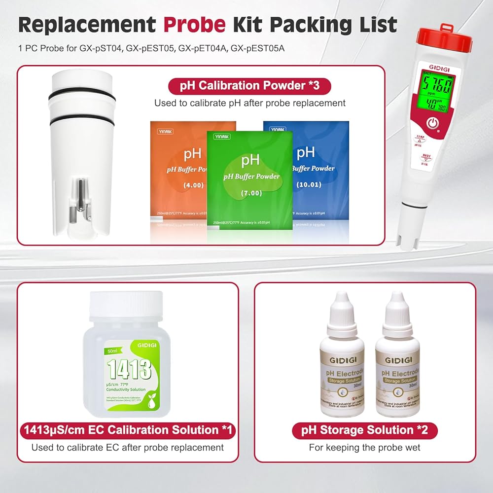مسبار الأس الهيدروجيني البديل لجهاز GIDIGI يعرض في الوقت نفسه مقياس الأس الهيدروجيني، وقطب الأس الهيدروجيني مع محلول معايرة EC 1413μS/cm ومحلول تخزين الأس الهيدروجيني لـ GX-T4، GX-T5