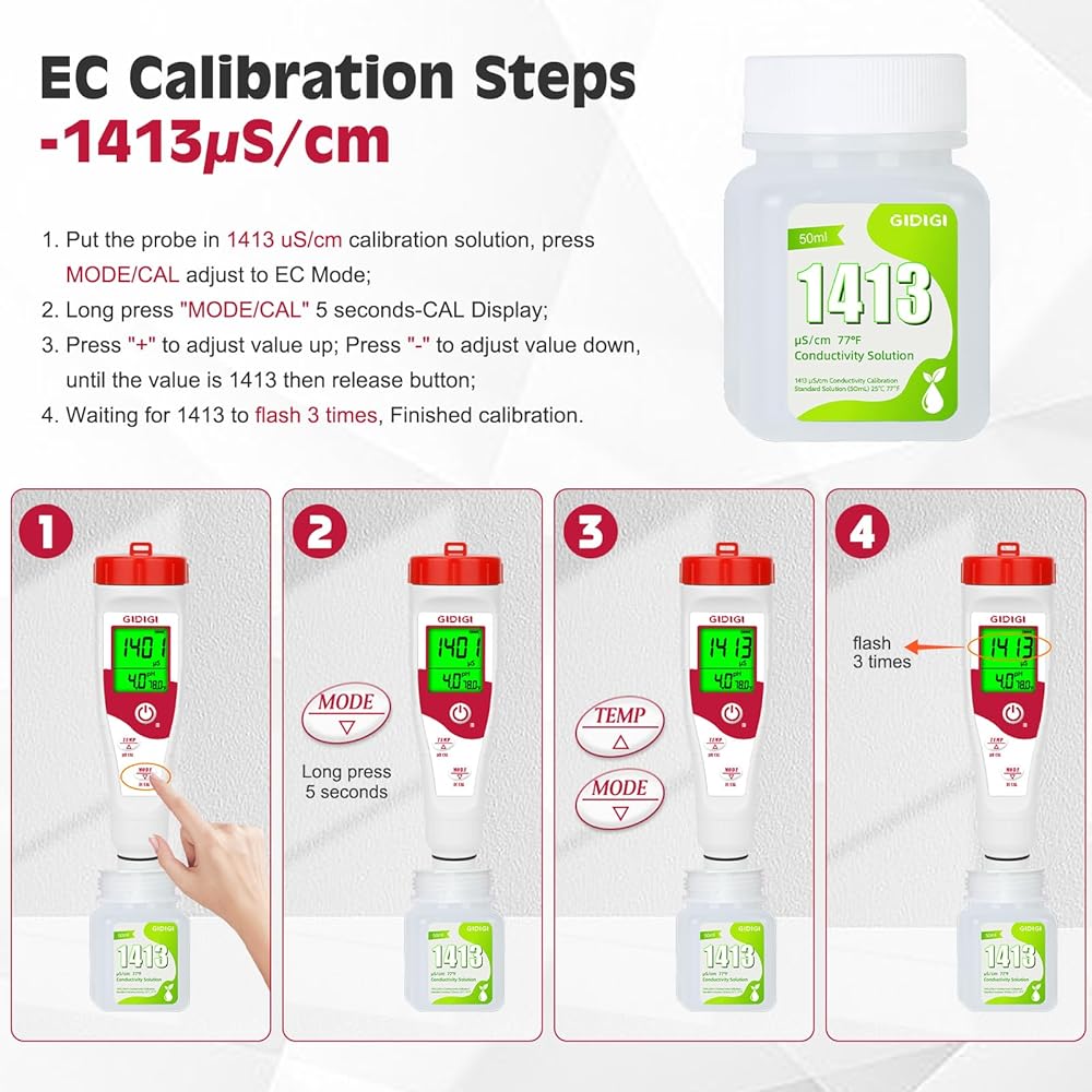 حل معايرة 1413μS/سم: من الحكمة المعايرة في المواقف التالية: ①عند تغيير قطب كهربائي TDS جديد ②عندما لا يتم استخدام القطب لفترة طويلة ③عندما تستخدم جهاز القياس في محلول قوي ④عندما يكون من المهم الحصول على قياس دقيق جدًا لـ TDS EC