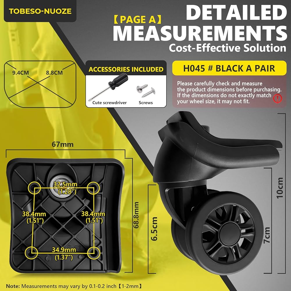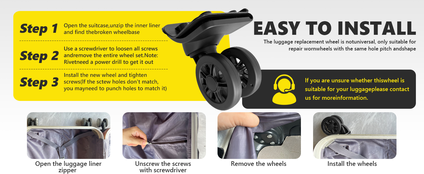 【سهلة التركيب مع جميع الأدوات المتضمنة】العودة إلى السفر بسرعة! نحن نقوم بتضمين مفك البراغي والمسامير اللازمة للتثبيت السريع والسهل. ليست هناك حاجة إلى أدوات إضافية. ما عليك سوى اتباع التعليمات لمنح عجلات الأمتعة المحمولة الخاصة بك حياة جديدة في دقائق.