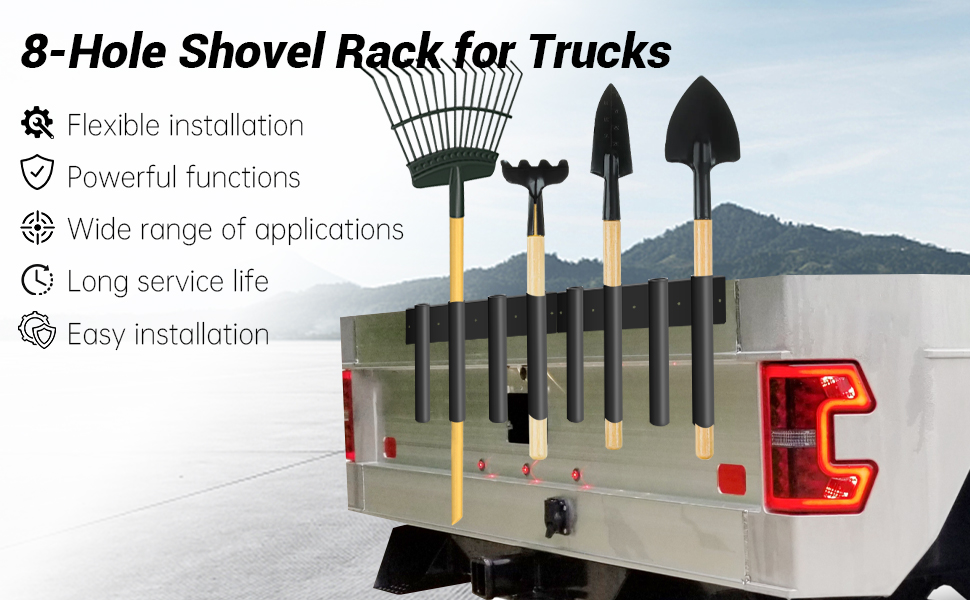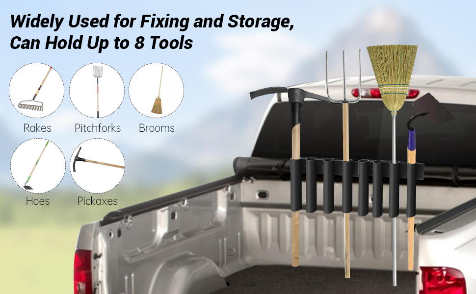 تخزين فعال للأدوات: يمكن لرف المجرفة ذو 8 فتحات إصلاح الأدوات التي يتم التعامل معها منذ فترة طويلة مثل المجارف والمجارف، مما يضمن ثبات الأدوات وعدم اهتزازها أثناء القيادة، وتجنب الفقد أو التلف بشكل فعال، والعثور على الأدوات المطلوبة في أي وقت وفي أي مكان.
