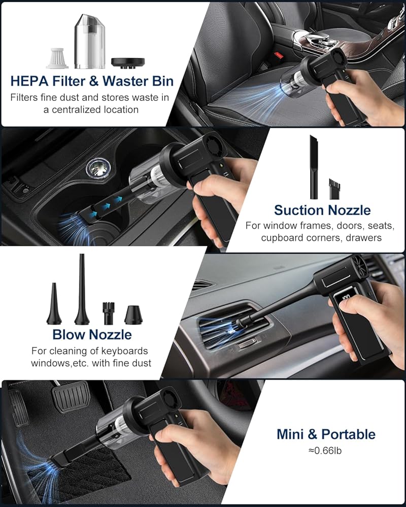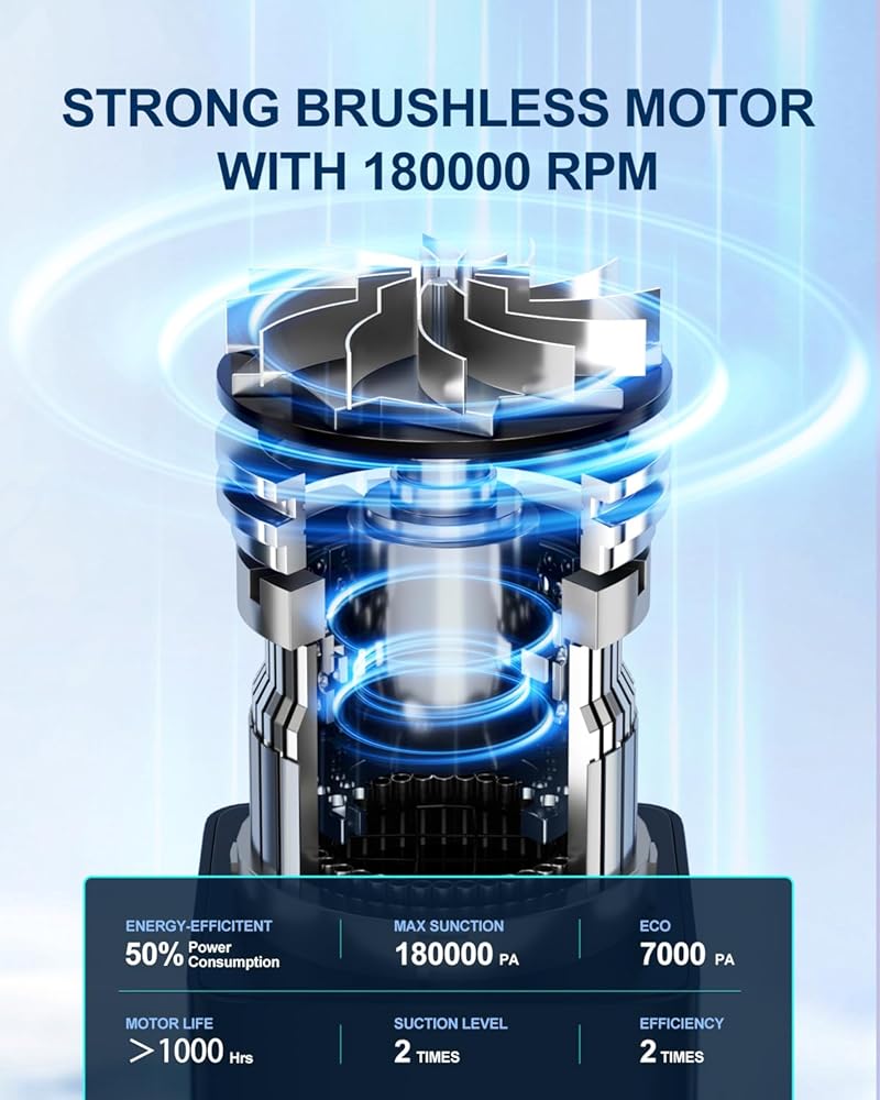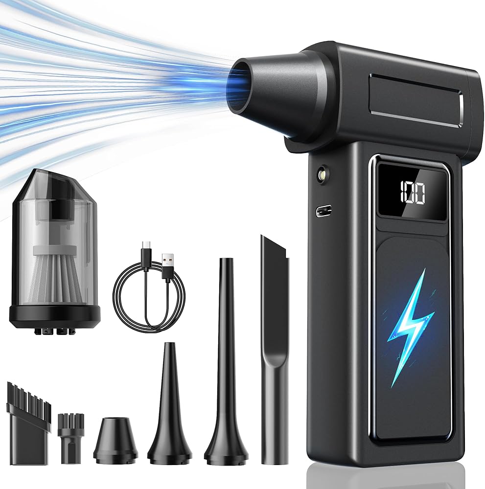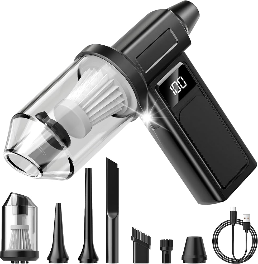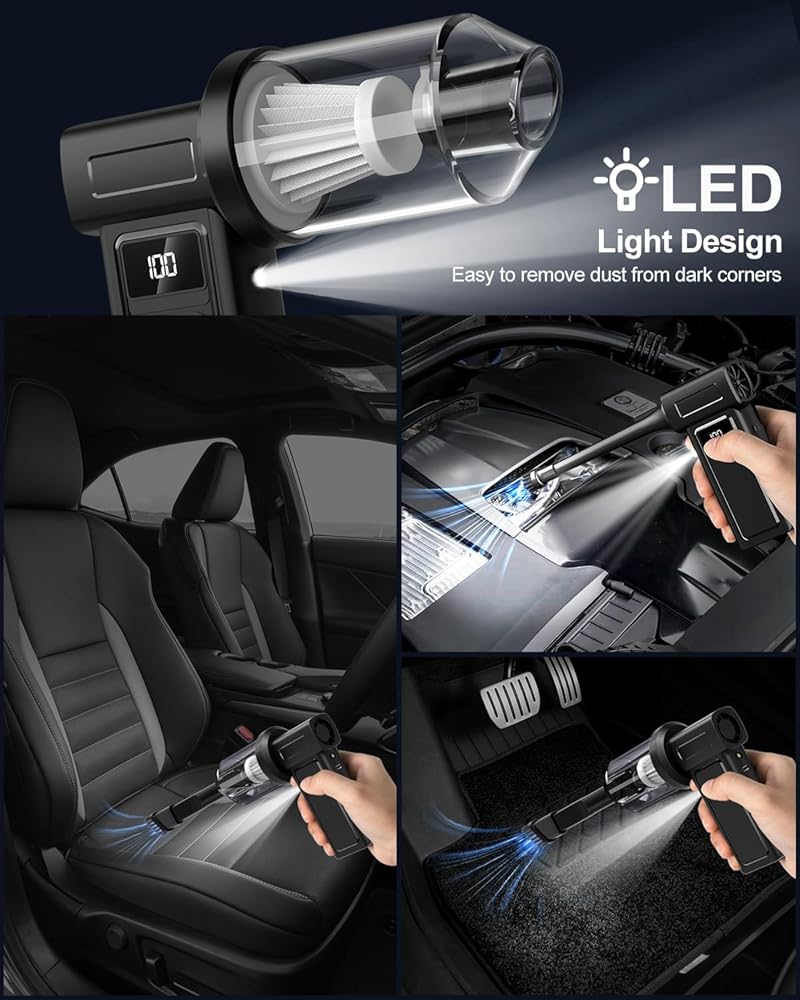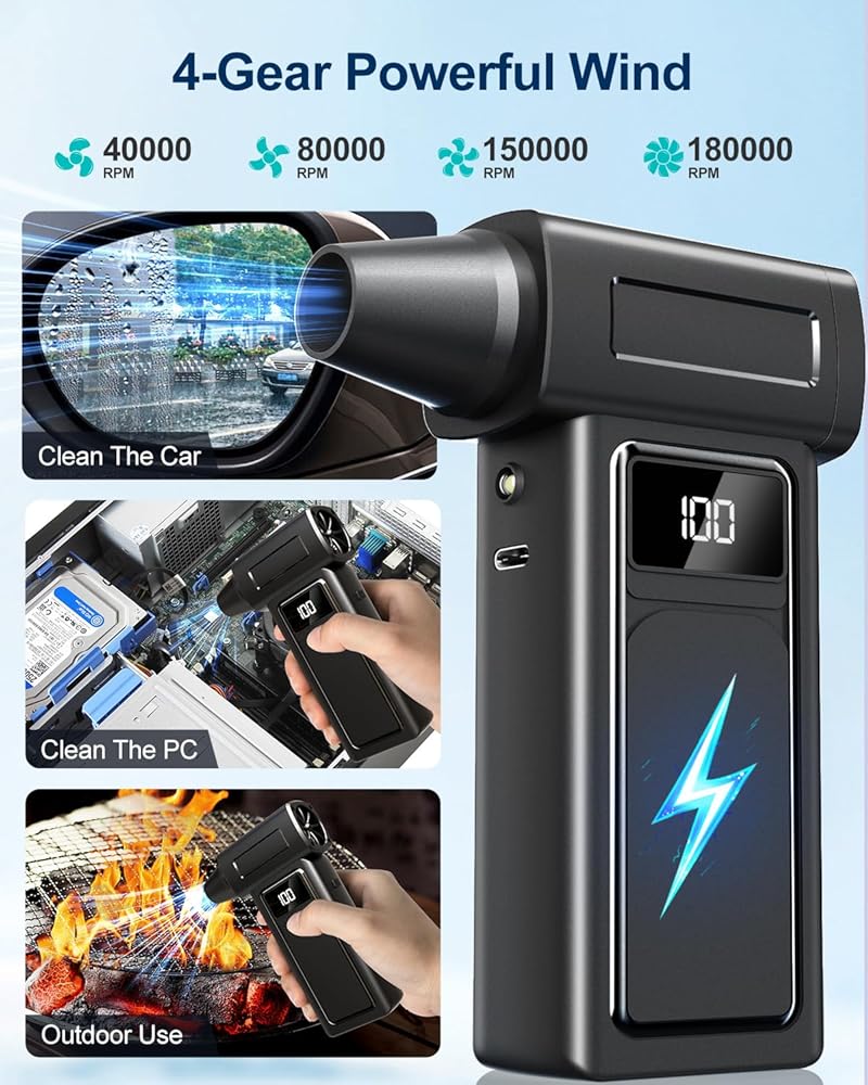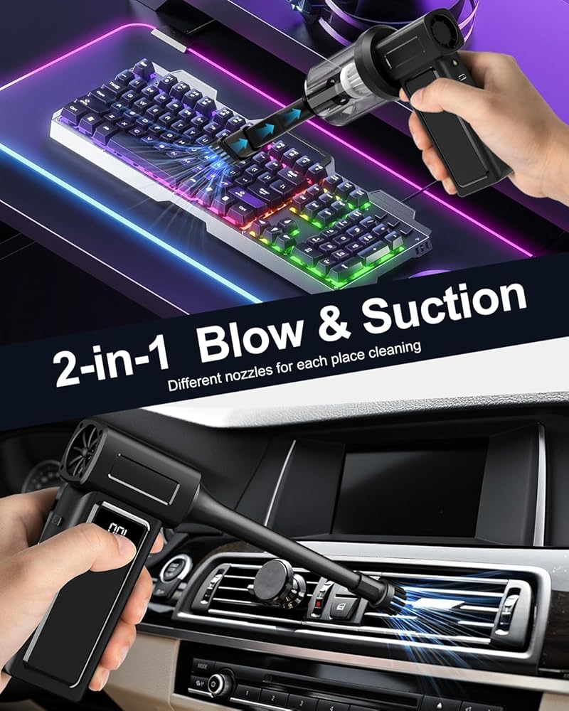 ⚡【180000 دورة في الدقيقة 2 في 1 منفاخ ومكنسة سيارة - قوة توربو 100 متر/الثانية】يوفر نظام الإعصار ثنائي الوظيفة تدفق هواء بحد أقصى 100 متر/الثانية لإزالة الغبار العنيد + الشفط العميق في وقت واحد؛ إزالة الحطام من لوحات المفاتيح/فتحات السيارة أسرع 3 مرات من الهواء المعلب، أثناء تنظيف الجزيئات المخفية في الشقوق (مثل مقاعد السيارة ومراوح الكمبيوتر الشخصي)؛ يتعامل التحكم في التروس بأربع سرعات مع الإلكترونيات الحساسة للأوساخ الثقيلة في الهواء الطلق؛
