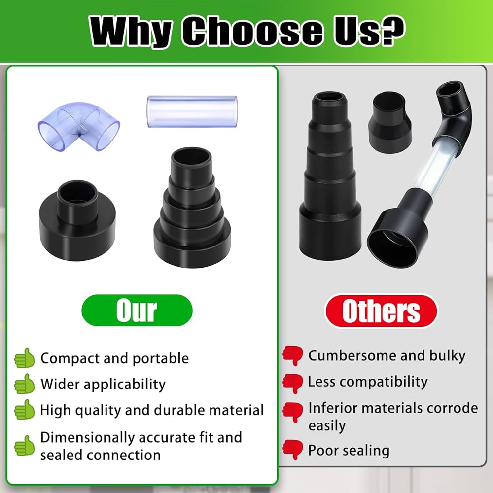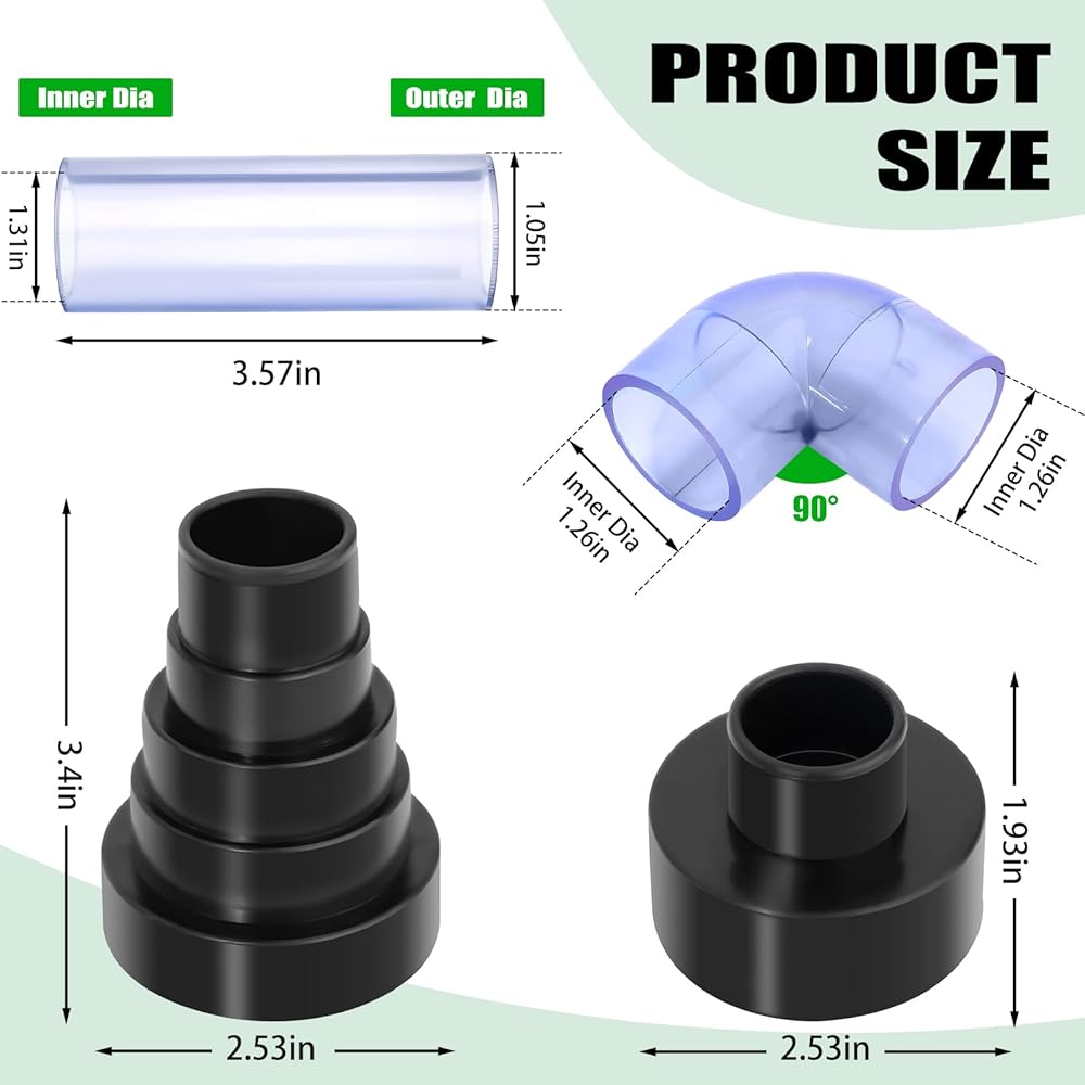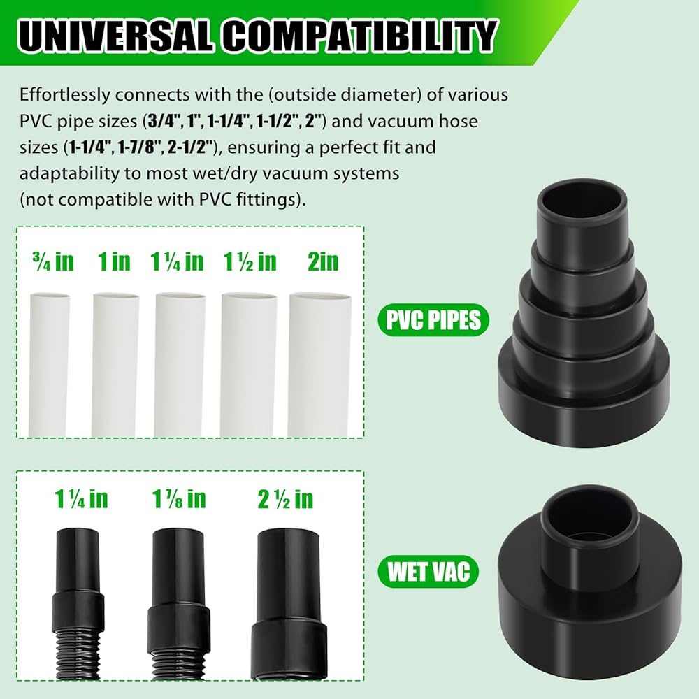 UNIVERSAL FIT: This A/C drain line vacuum adapter Effortlessly connects with the (outside diameter) of various PVC pipe sizes 3/4"", 1"", 1-1/4"", 1-1/2"", 2"" and vacuum hose sizes 1-1/4"", 1-7/8"", 2-1/2"" Designed specifically, The Adapter features a multi-sized universal base designed to connect to most HVAC drain lines and PVC pipe