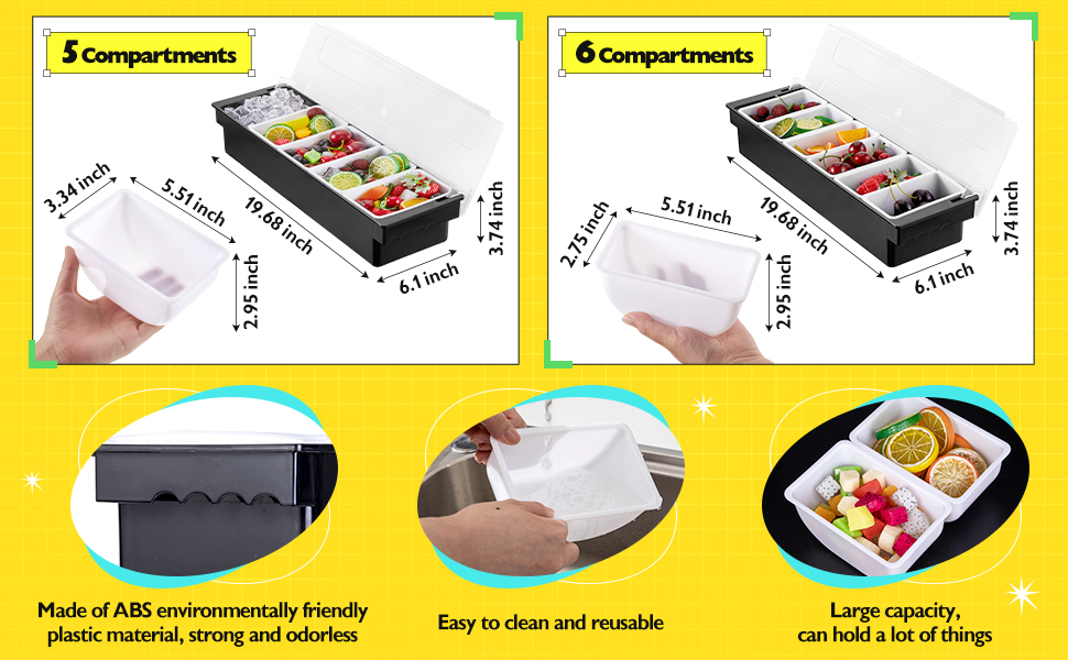 مادة آمنة: صواني تقديم التوابل هذه مصنوعة من بلاستيك أكريلونتريل بوتادين ستايرين الصديق، بدون سموم ولا رائحة سيئة، موثوقة وقوية، قابلة للغسل وإعادة الاستخدام، ولن تنكسر بسهولة، ويمكن وضعها لفترة طويلة.