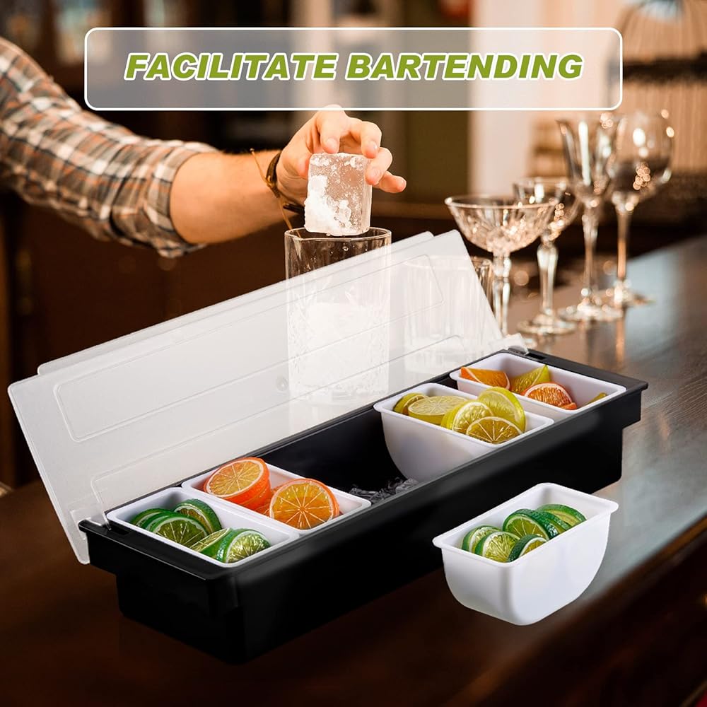 صينية بهارات البار مع غطاء: منظم طبقة البيتزا هذا مستطيل الشكل، مصمم بغطاء أبيض وقاعدة سوداء، ومع 6 مساحات يمكن أن تساعدك على فرز الطعام بشكل جيد ولن يختلط، مما يمنحك تجربة استخدام لطيفة.