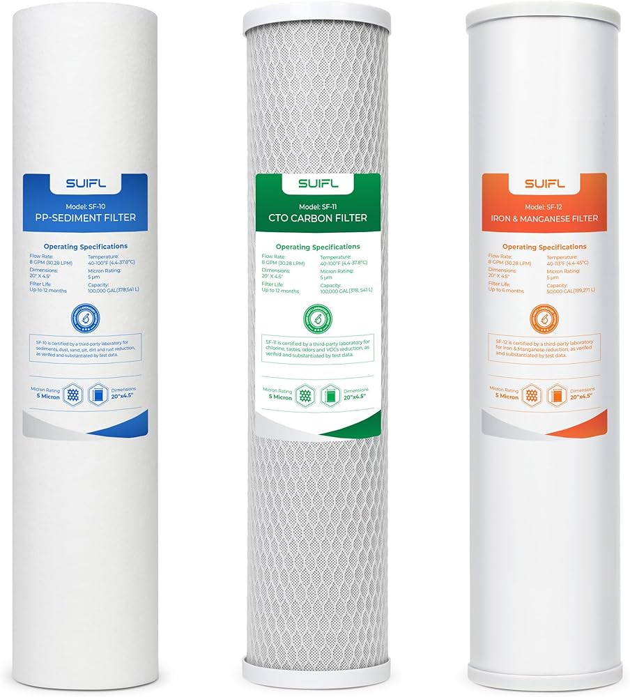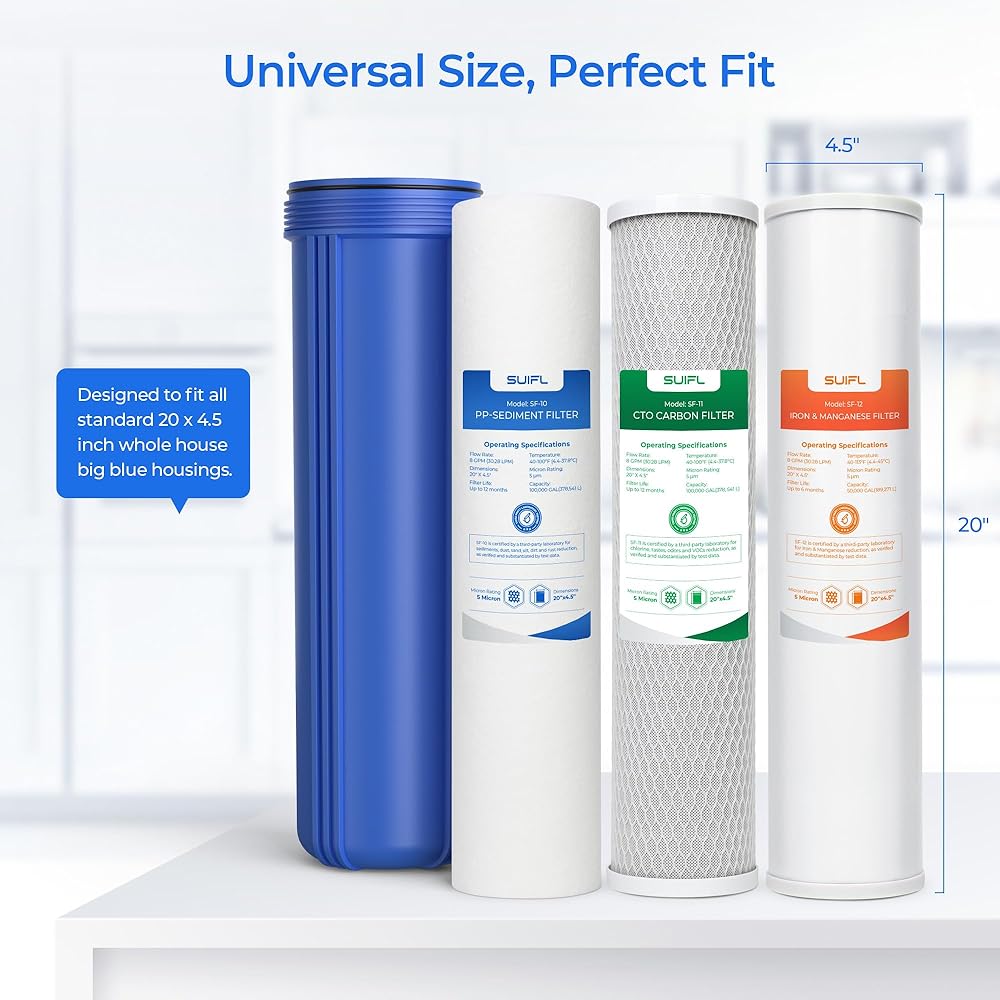مجموعة فلتر مياه منزلية كاملة 4.5 * 20 بوصة، متوافقة مع Express Water WH300SICS، FLTWH2045ICS1، iSpring WGB32BM، F3WGB32BM، حزمة مع PP، CTO، فلتر الحديد والمنغنيز، مجموعة واحدة