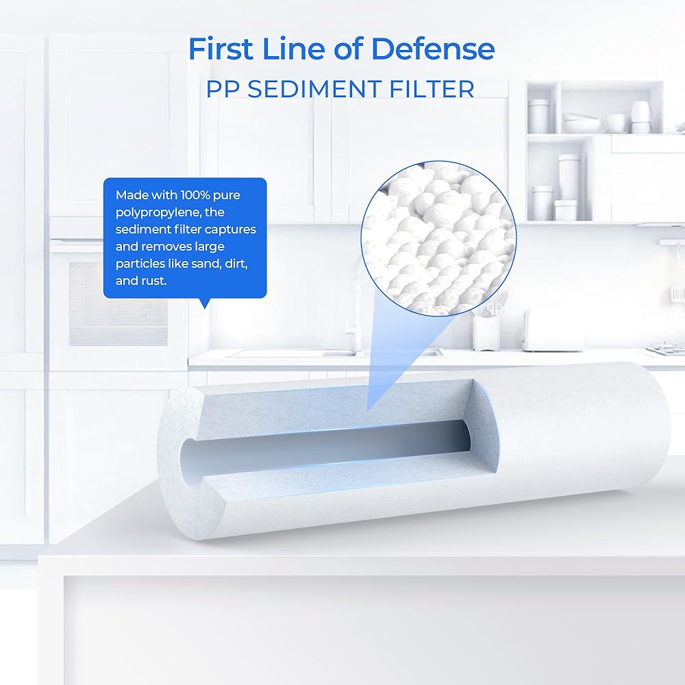 • يلتقط مرشح الرواسب 5 ميكرون للمرحلة الأولى الجزيئات الكبيرة ويزيلها مثل الرمل والأوساخ والصدأ، مما يقلل من غيوم المياه وعكرها، وبالتالي حماية وإطالة عمر مرشحات المرحلة 2، المرحلة 3.