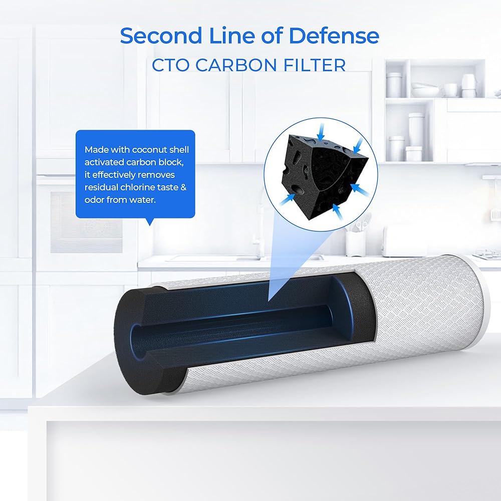 • مصنوع من الكربون المنشط، يعمل فلتر CTO على تقليل الكلور المتبقي وتغير اللون والروائح والجزيئات الدقيقة العالقة من الماء بشكل فعال. فهو يساهم في تحسين جودة المياه بشكل عام ويجعل المياه أكثر وضوحًا وعديمة الرائحة وذات مذاق أفضل.