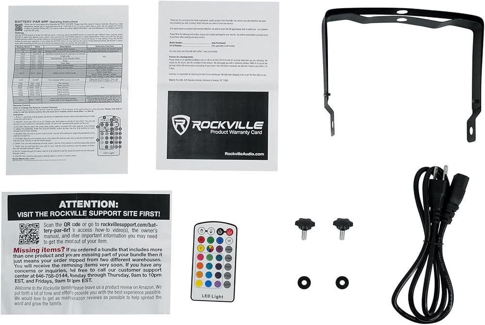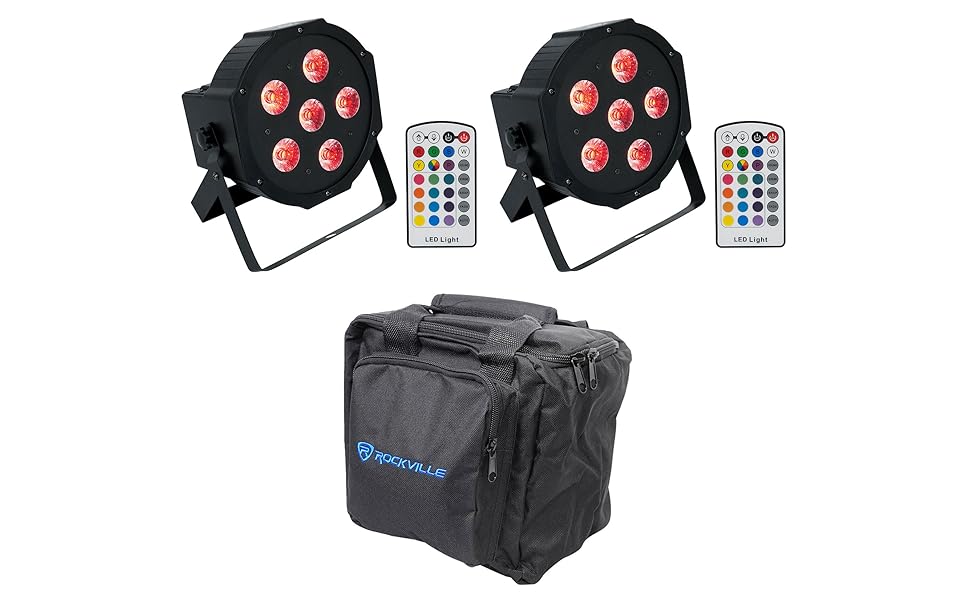تشمل العبوة: (2) بطارية Rockville PAR 6RF القابلة لإعادة الشحن RGBWA+UV Wireless DMX LED Light + جهاز تحكم عن بعد RF، (1) حقيبة سفر عالمية Rockville RLB90 تناسب 2x Par Lights + وحدة تحكم + كابلات