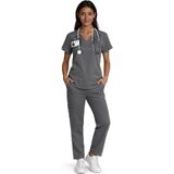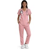 • FLATTERING V-NECK DESIGN WITH PRACTICAL ELEMENTS: This women's scrub top combines a stylish V-neck with contouring back darts for a professional silhouette. Innovative angled seams below the shoulders incorporate secure grip elastic bands, ideal for keeping identification badges and essential items firmly in place throughout your movement