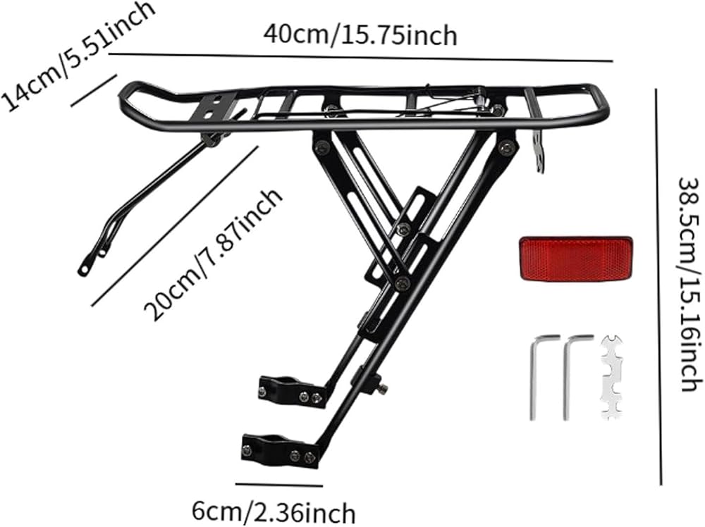 • 【Complete Package】: Includes 1 Bicycle Rear Rack, ready to mount. Dimensions: 40cm x 38.5cm (15.75 inch x 15.16 inch).