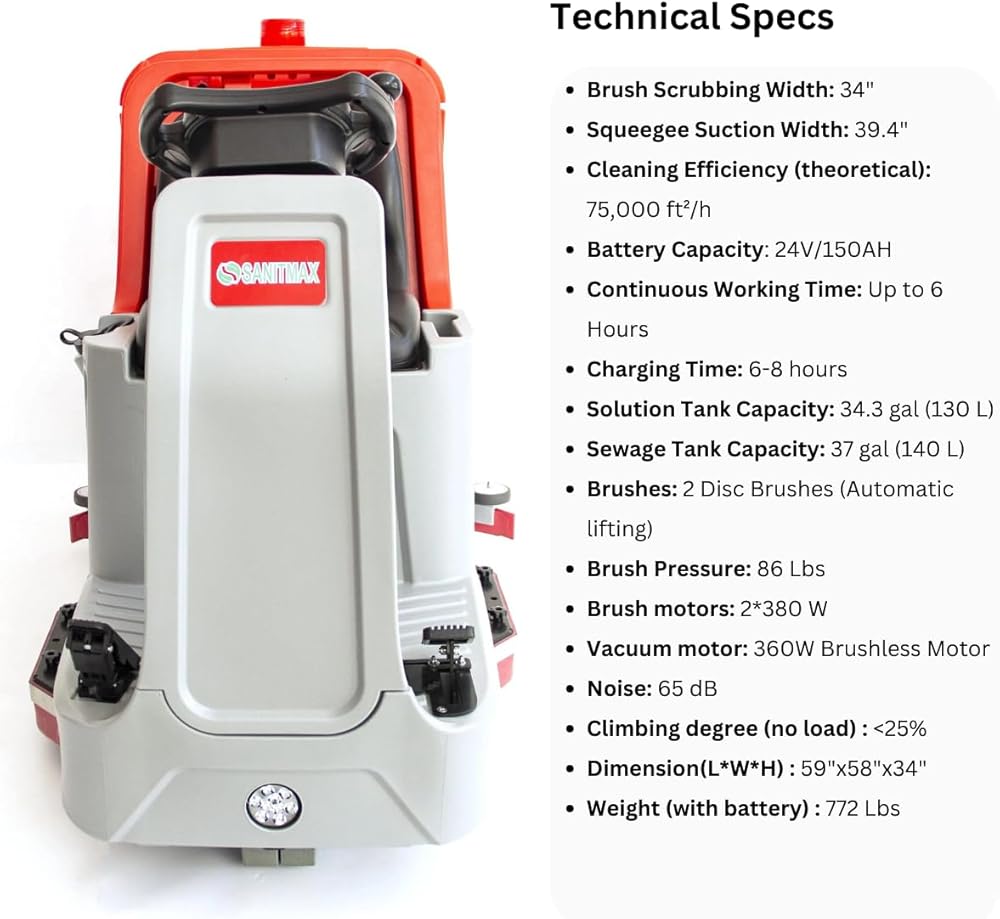 بطارية تعمل بما يصل إلى 4 ساعات من التشغيل: مدعوم بنظام بطارية الرصاص الحمضية 24 فولت (150 أمبير)، يوفر SM860 أكثر من 4 ساعات من وقت العمل لكل شحنة، مع شاحن مدمج 24 فولت/24 أمبير لتشغيل يومي موثوق.