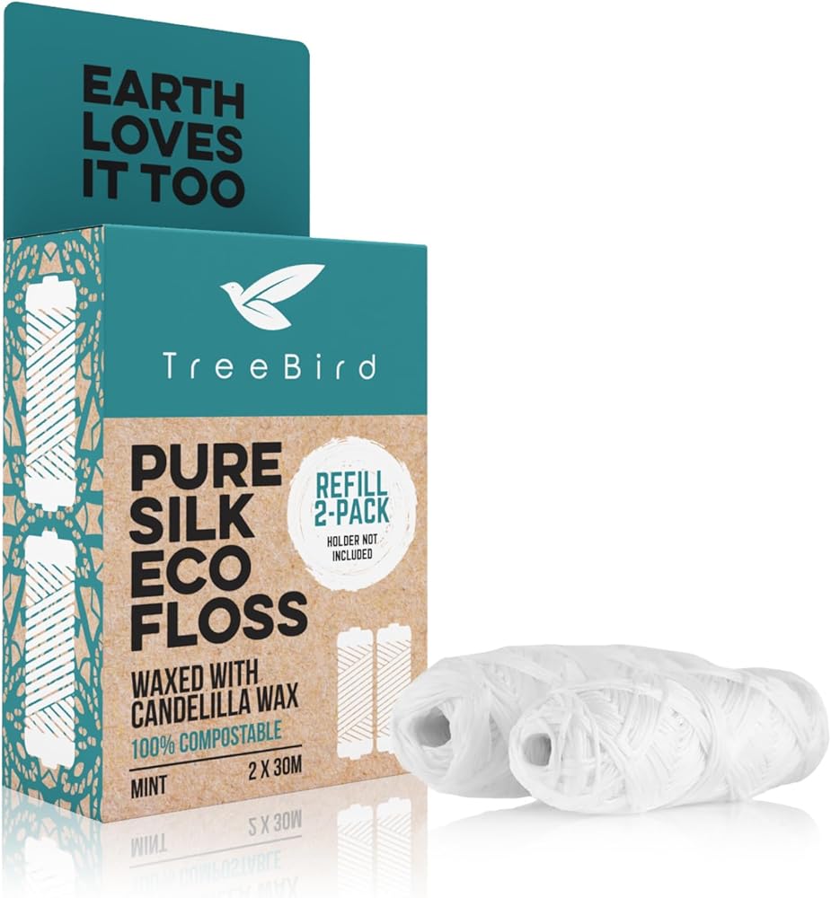 TreeBird Pure Silk Eco Floss Refills are designed for people who want floss made from silk fibers rather than synthetic thread. Each spool is made from peace silk and coated with plant-based Candelilla wax, creating a lightly textured thread that grips and lifts debris instead of sliding over it.